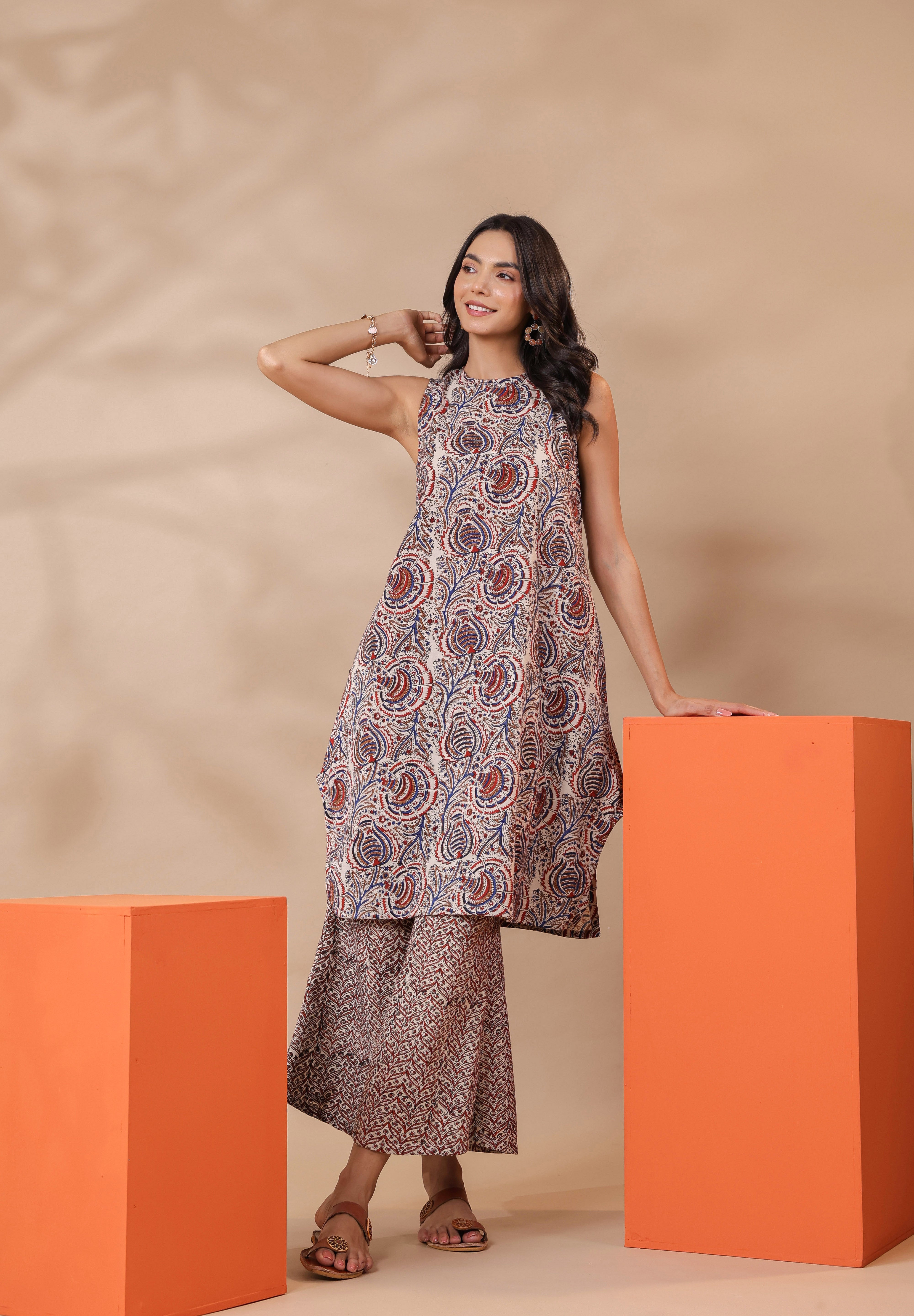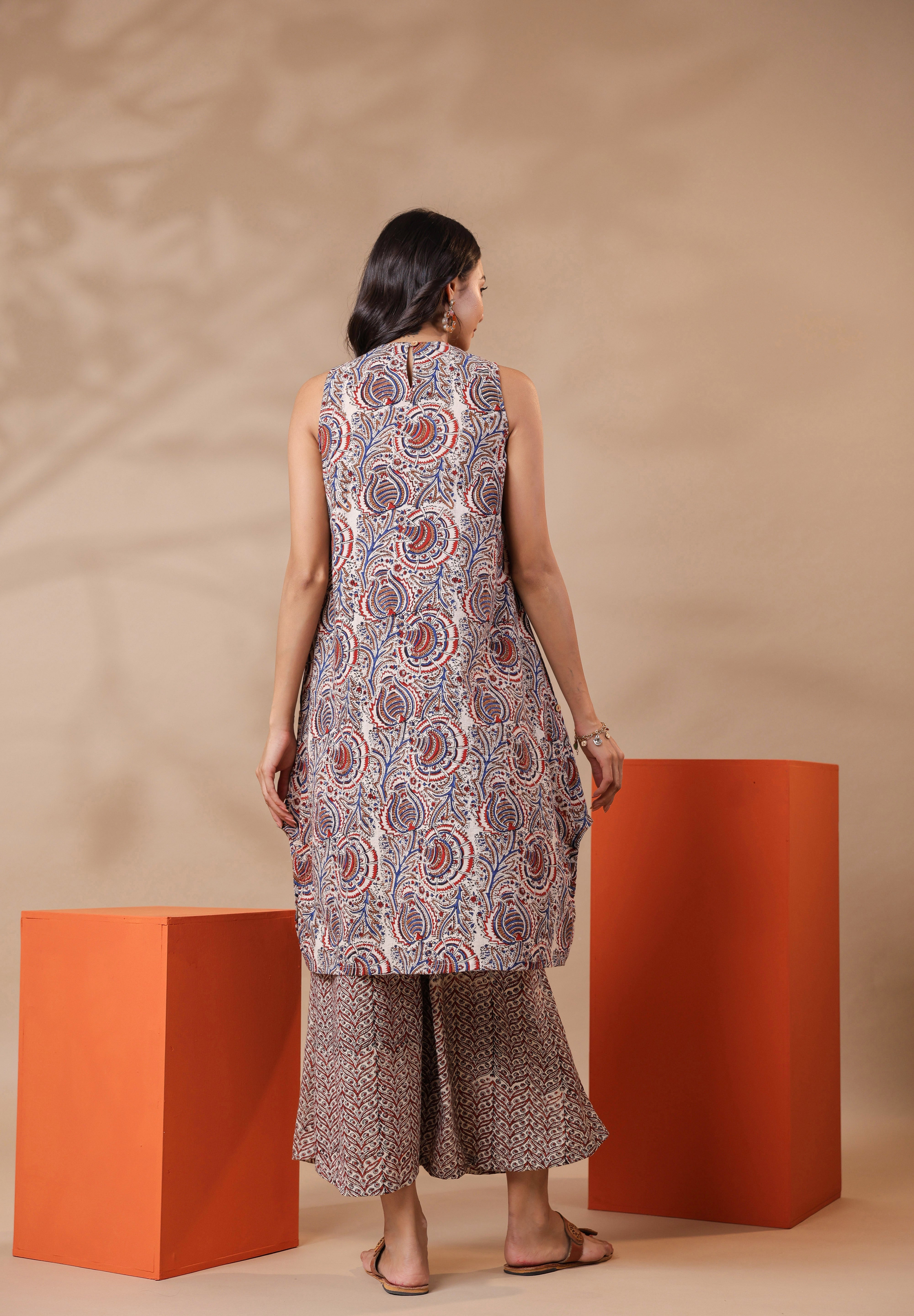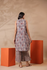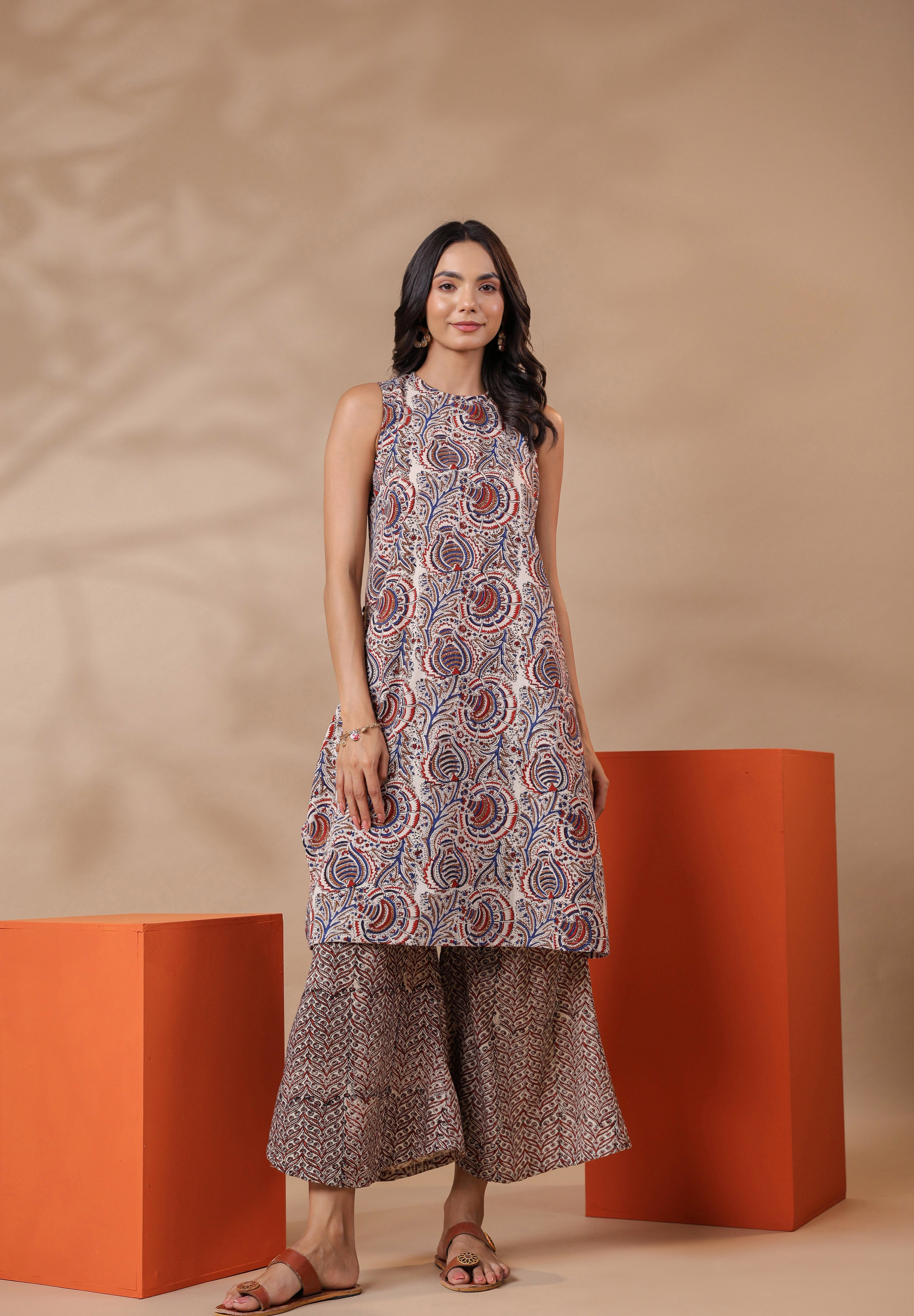 Cream Handblock Printed Sleeveless Cotton Kurta & Pants Set