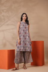 Stay effortlessly stylish with this black printed sleeveless cotton kurta and flared pants set. Designed for comfort and ease, the kurta features two practical pockets and charming wooden button detailing.