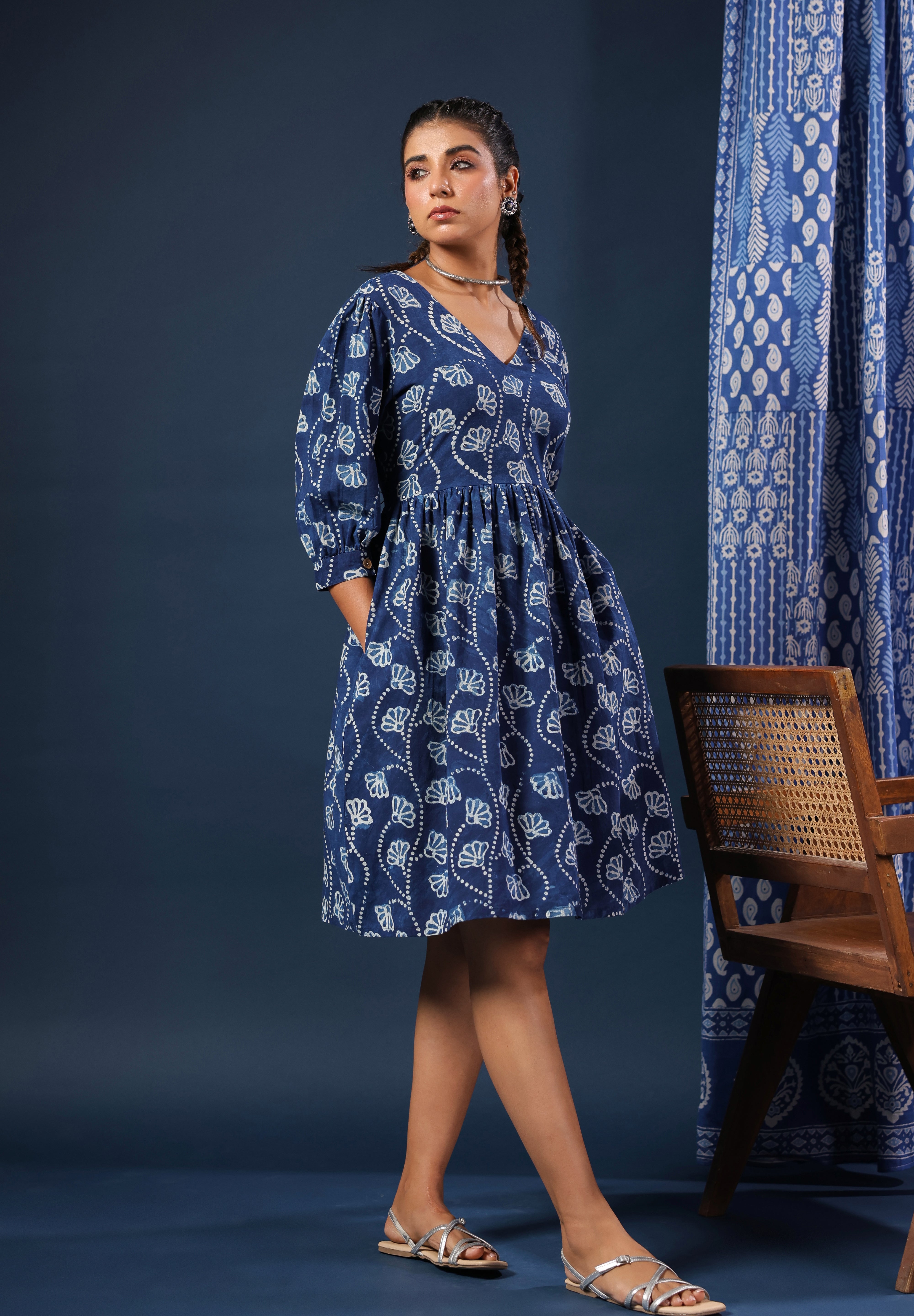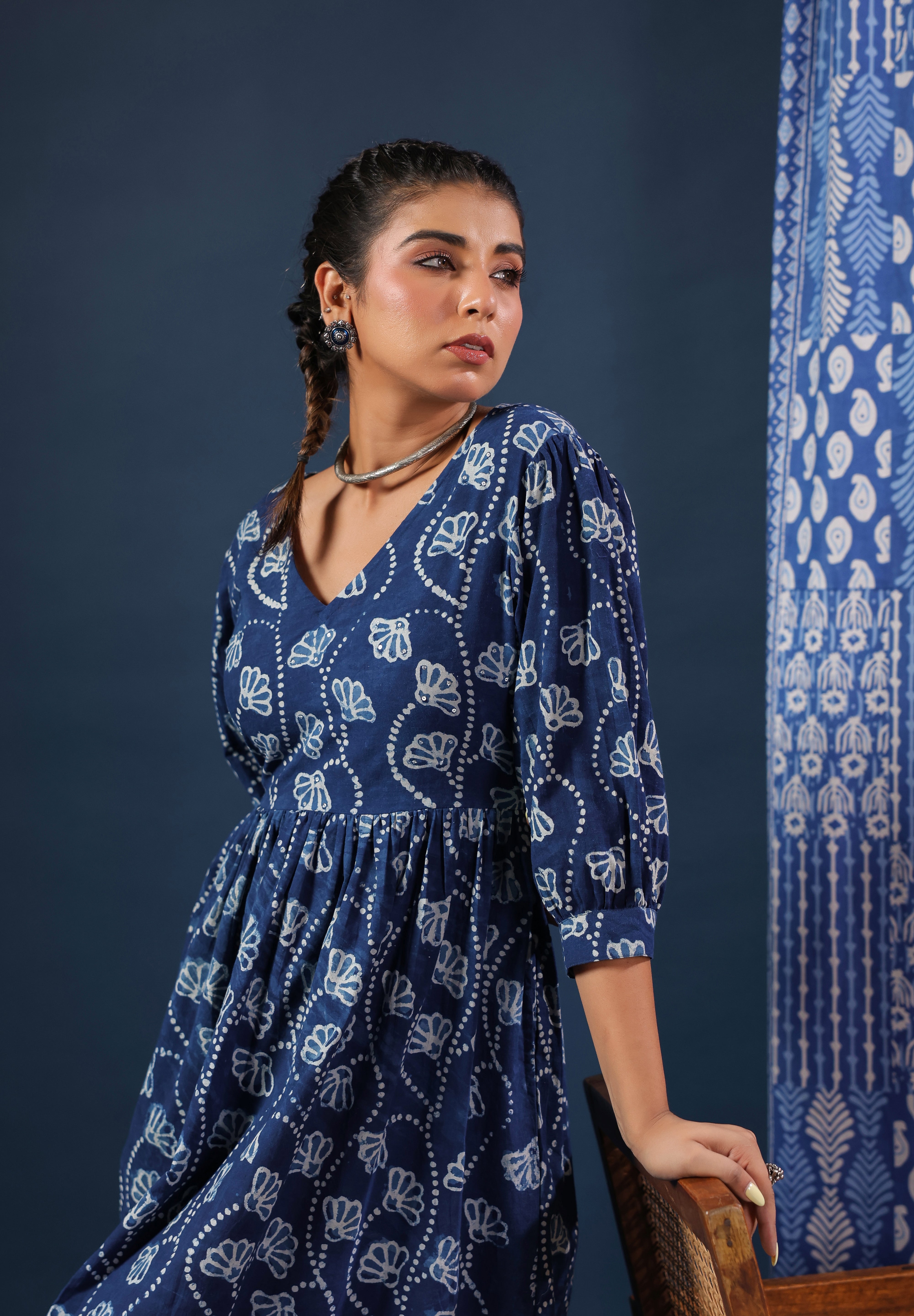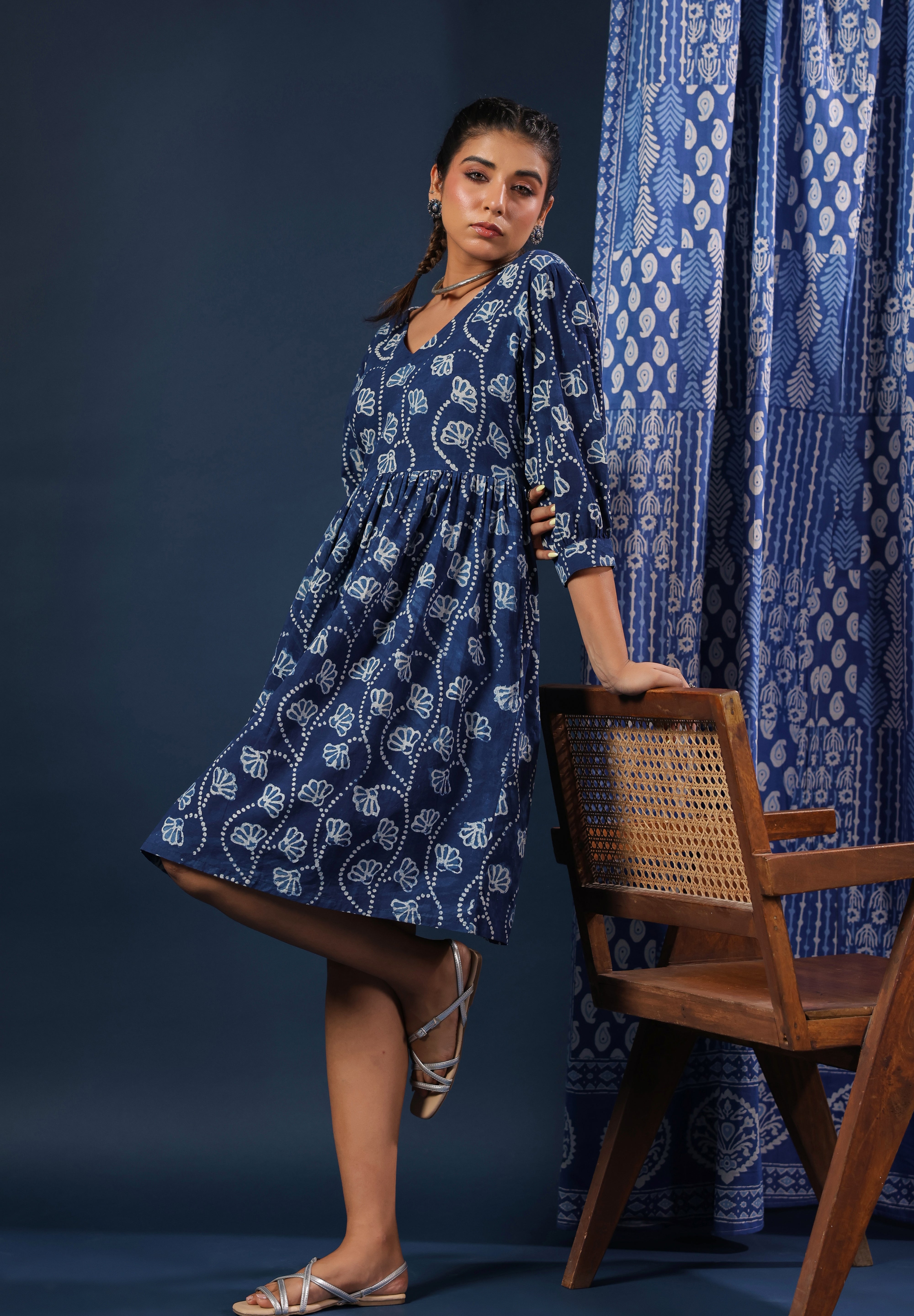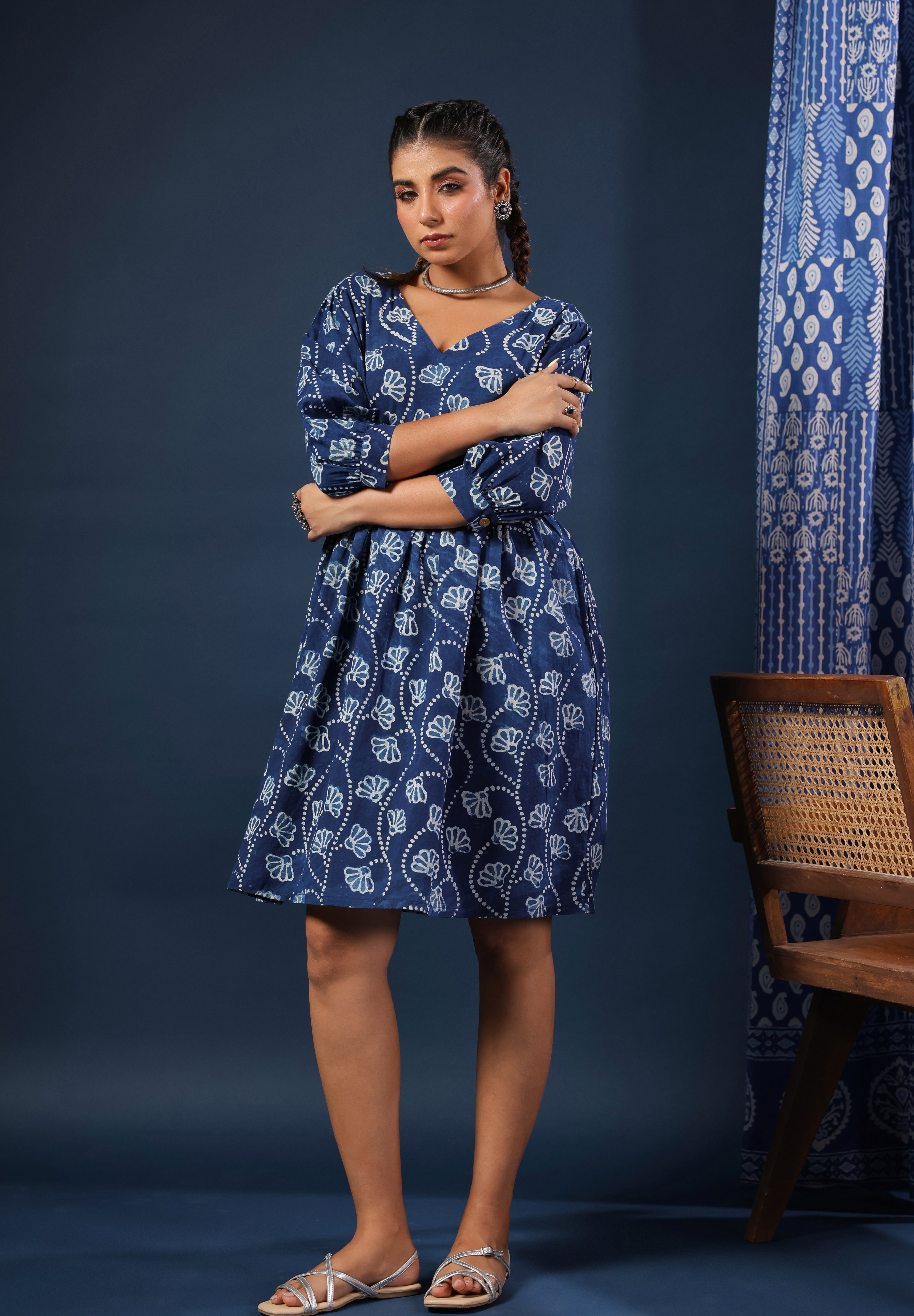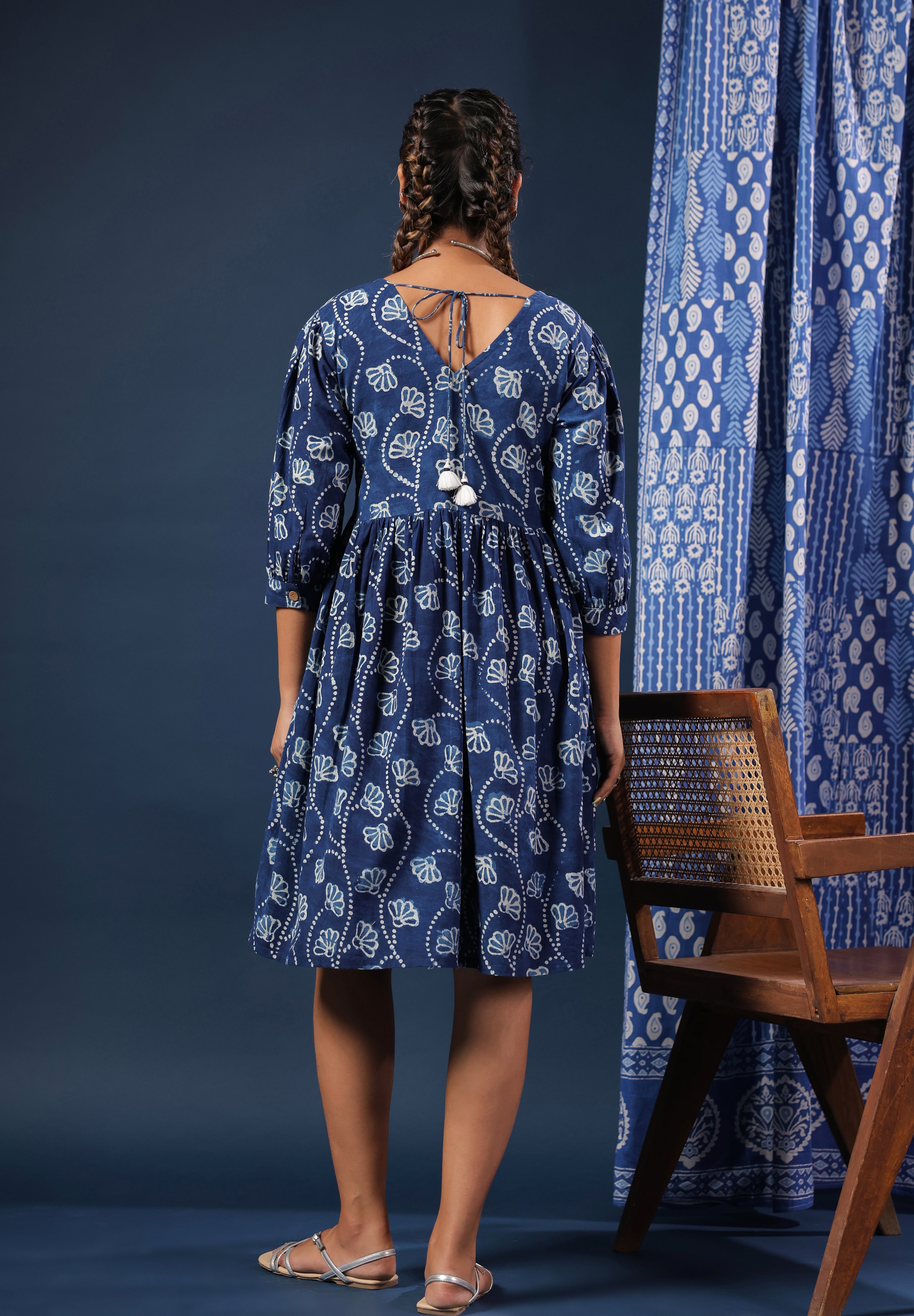 A breezy blend of tradition and trend, this indigo printed dress features a flattering V-neck front and back, finished with dori and tassels for a charming touch. Perfect for warm days and easy outings.