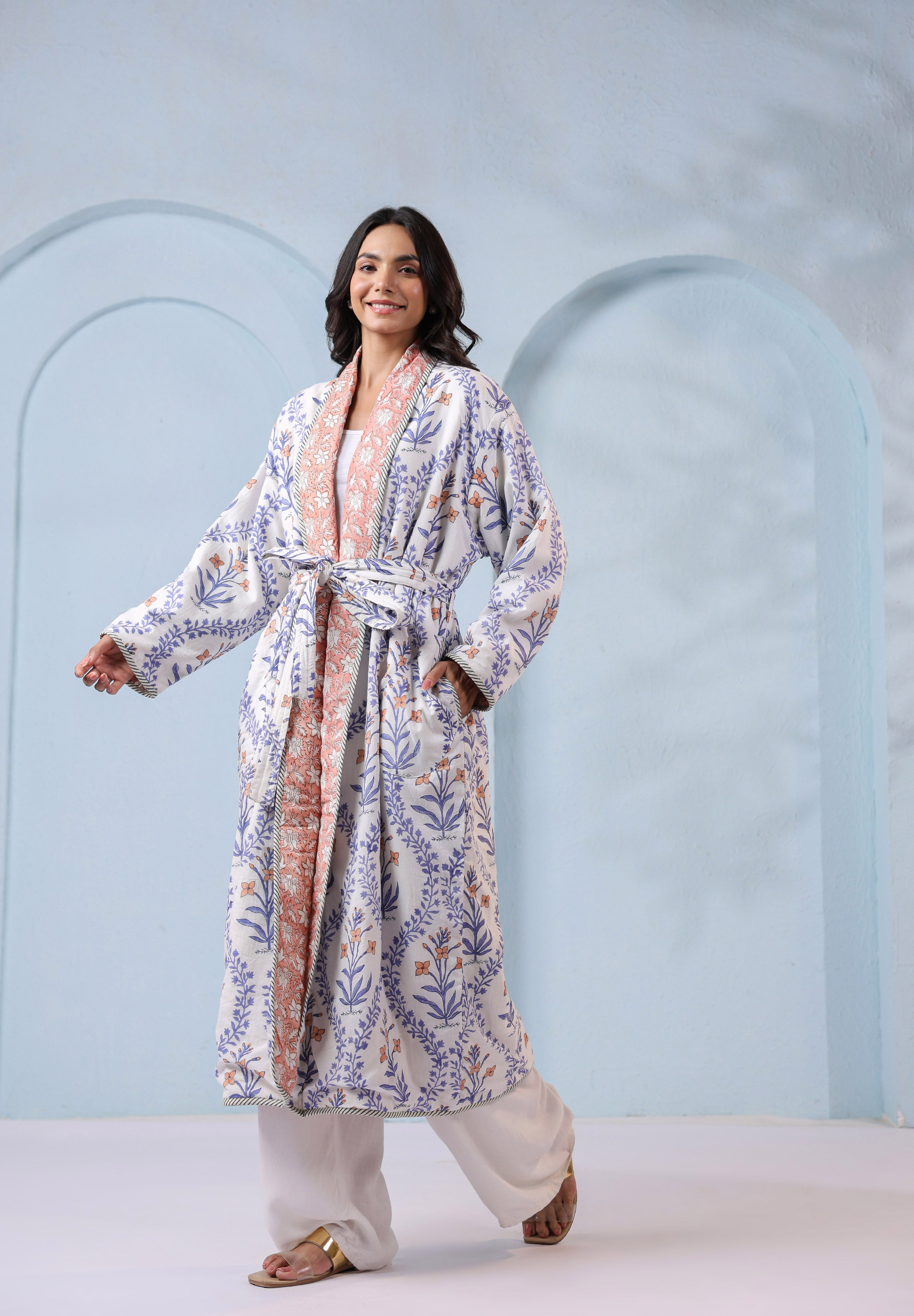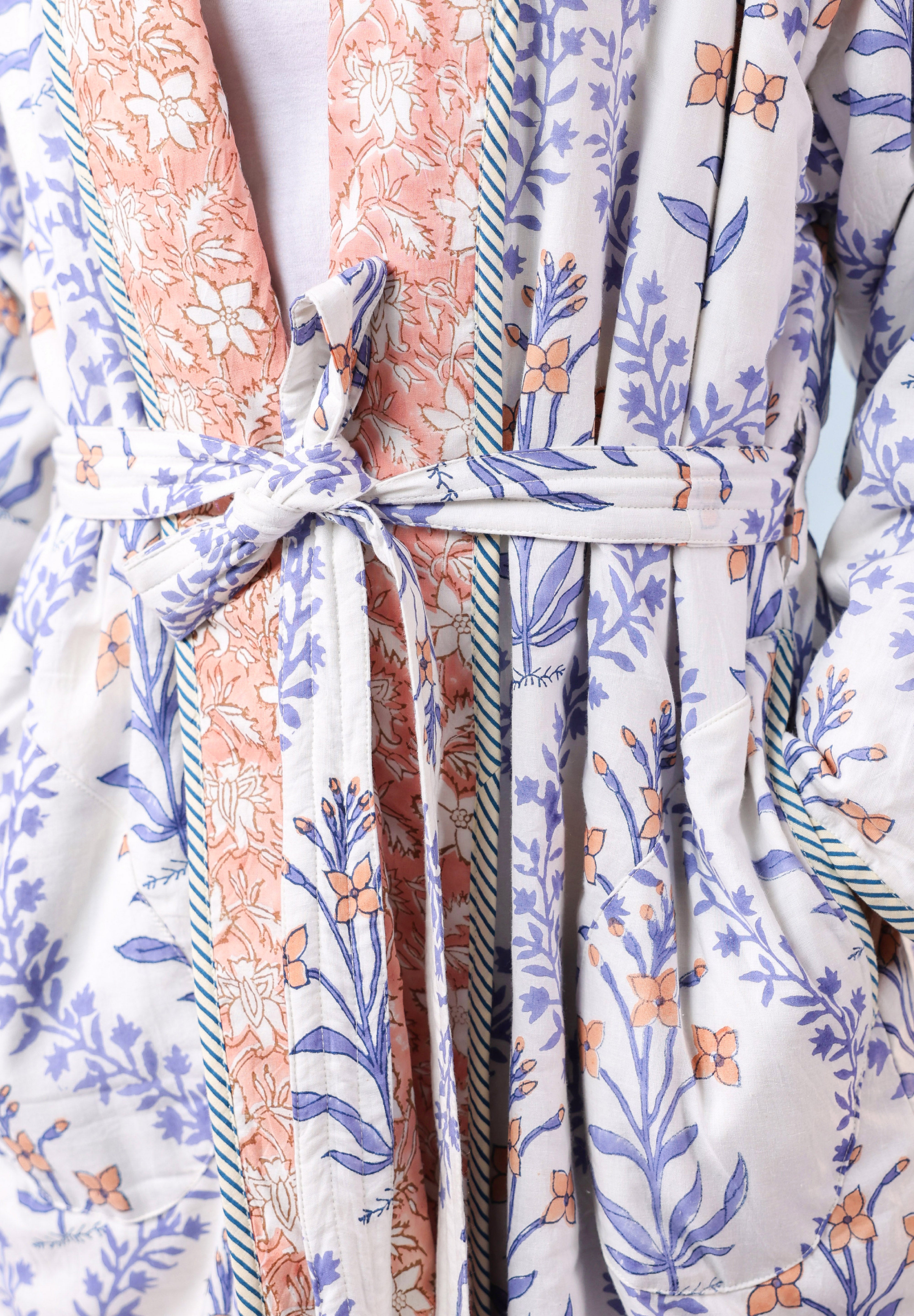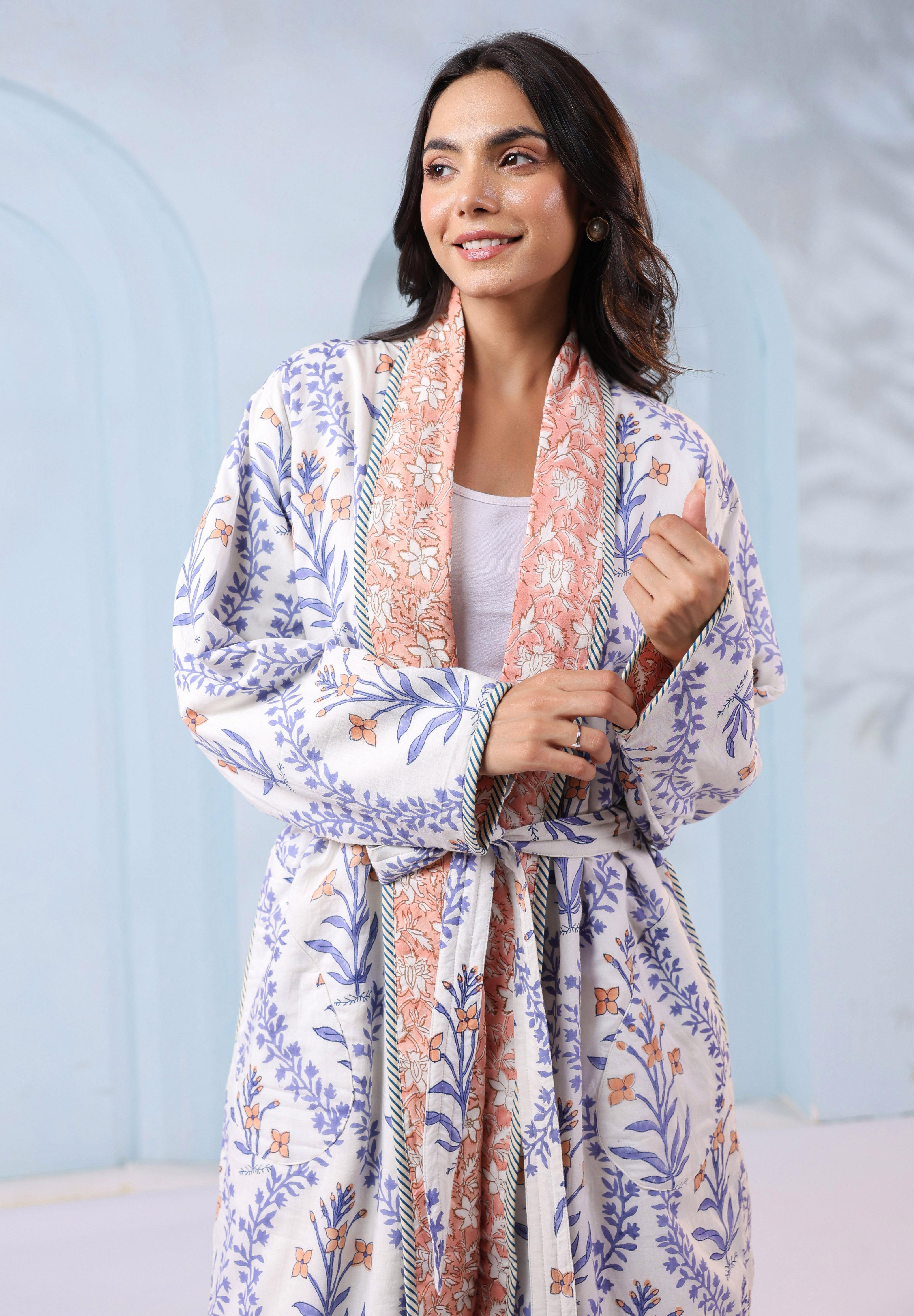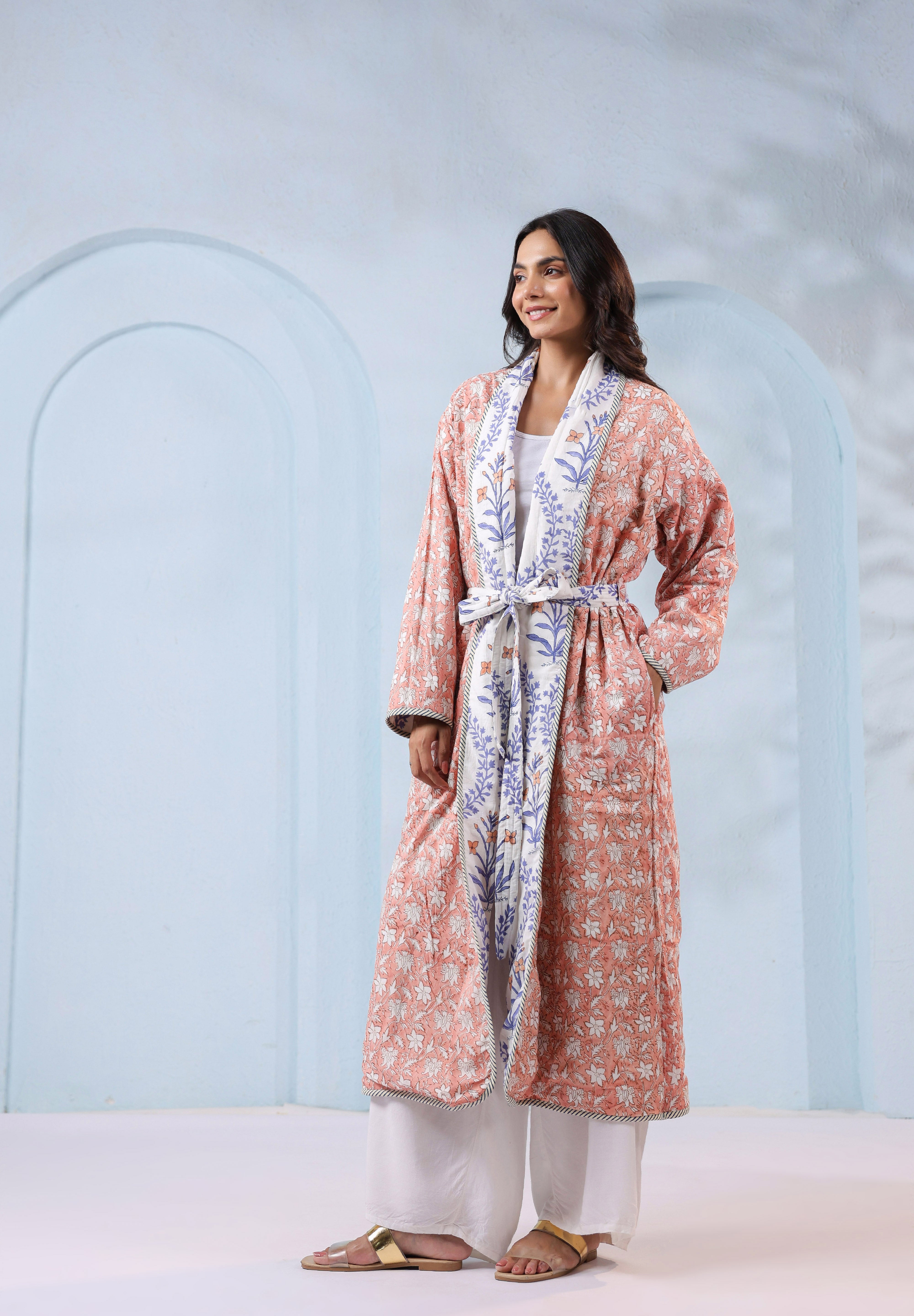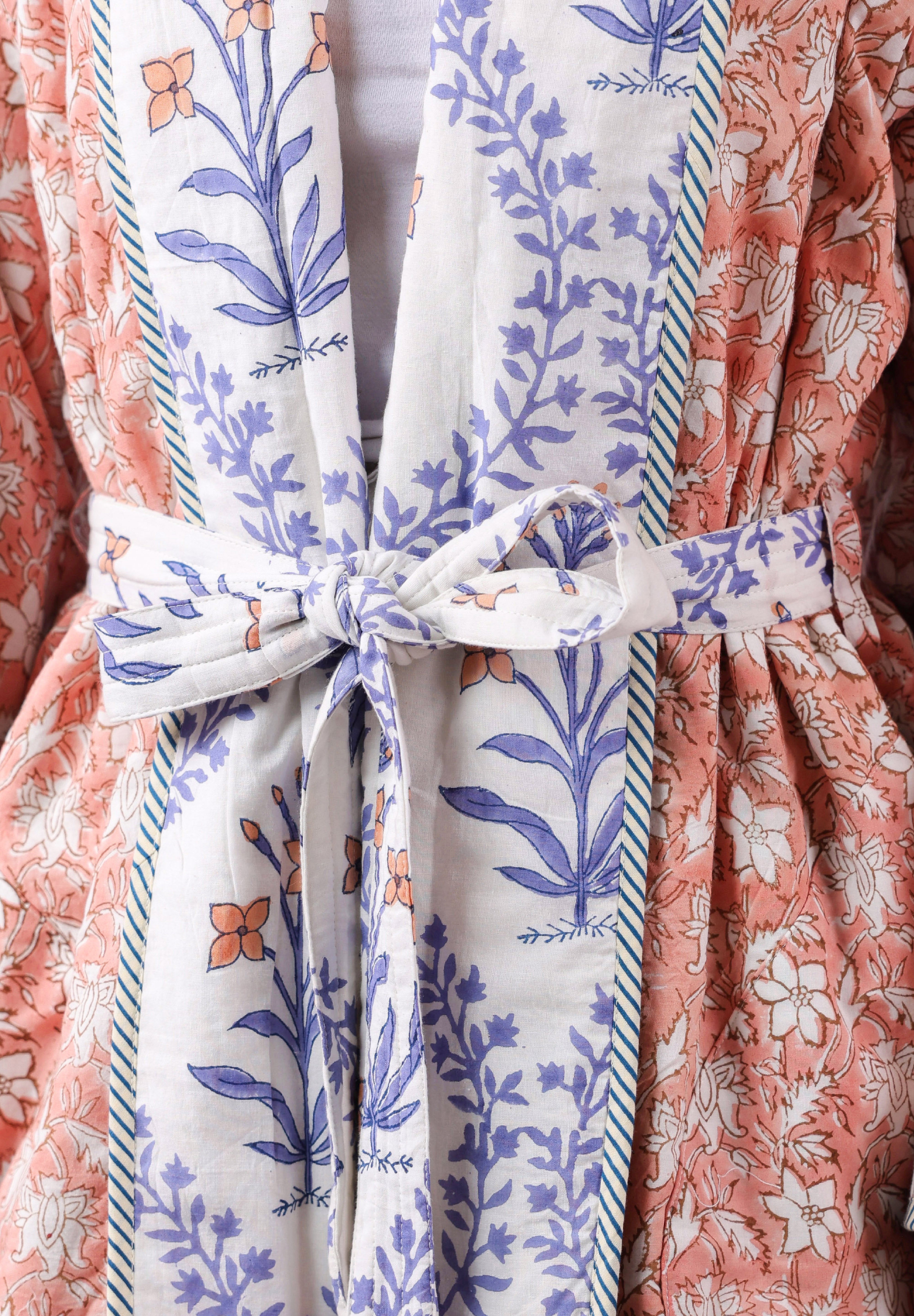 Experience the freedom of a free-size fit, adorned with intricate handblock printing. Embrace versatility with the reversible design, while enjoying the luxurious comfort of quilted 100% cotton. Elevate your winter comfort with this uniquely crafted and stylish robe.
