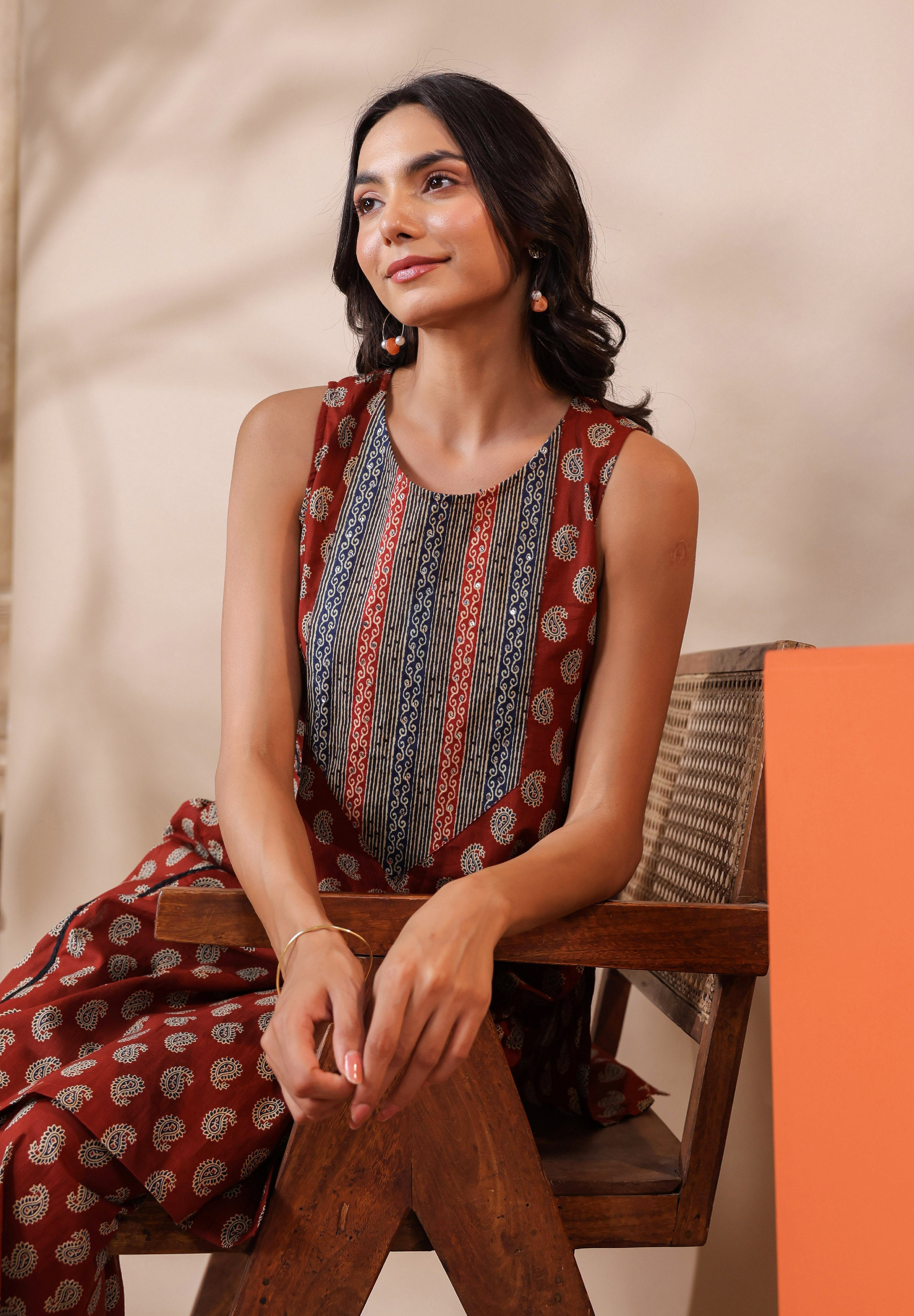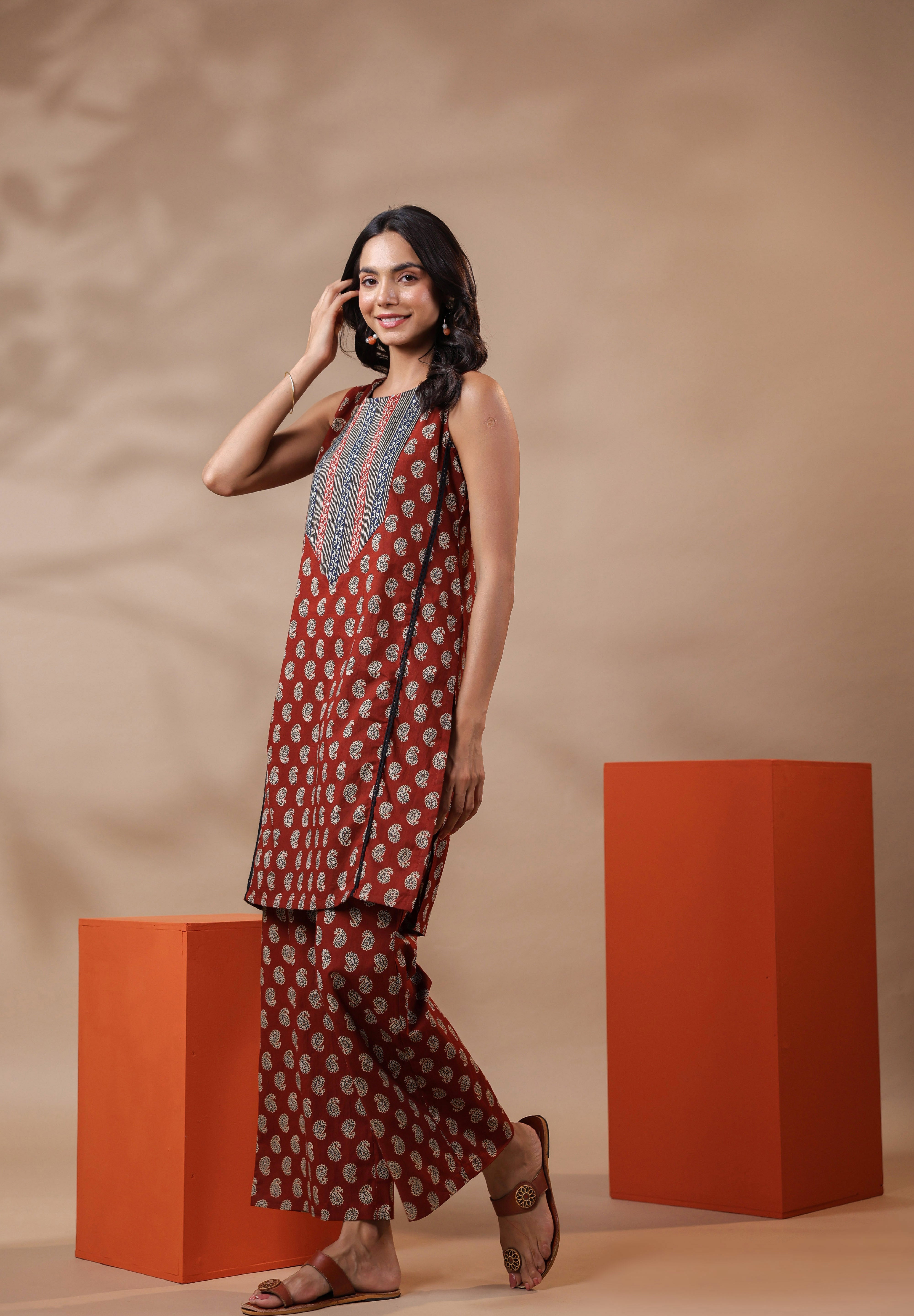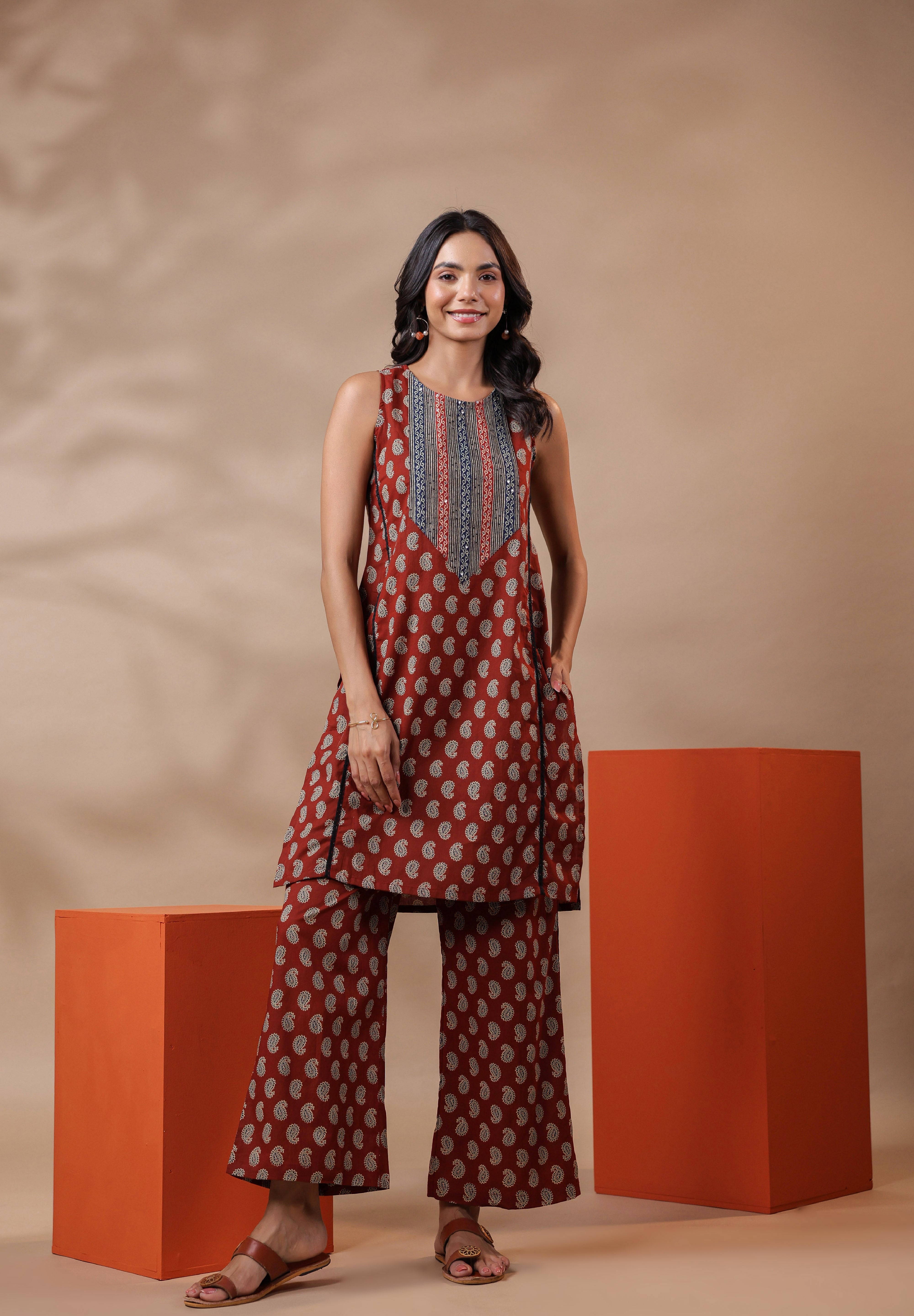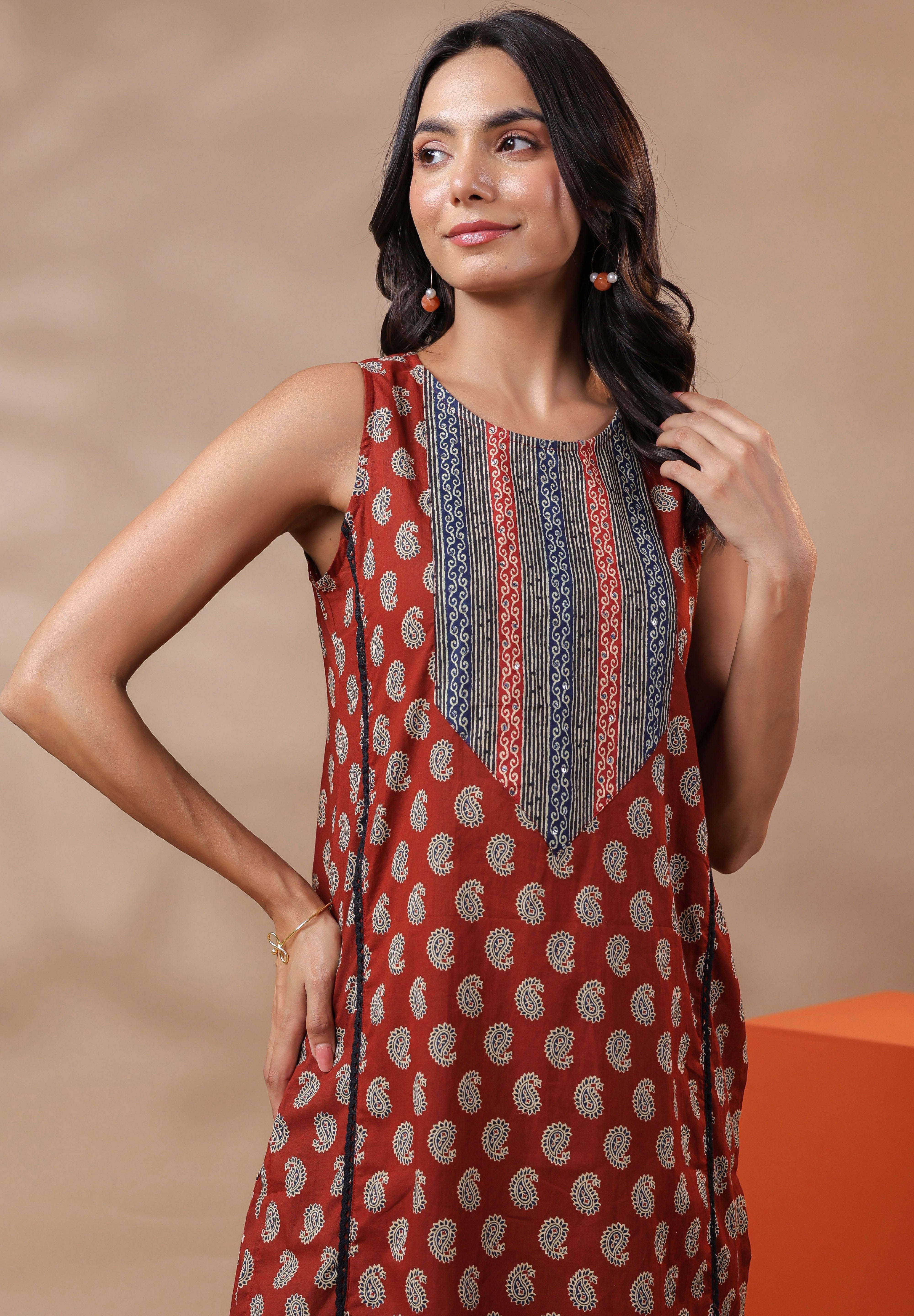 - Design: Sleeveless kurta with a classic round neckline