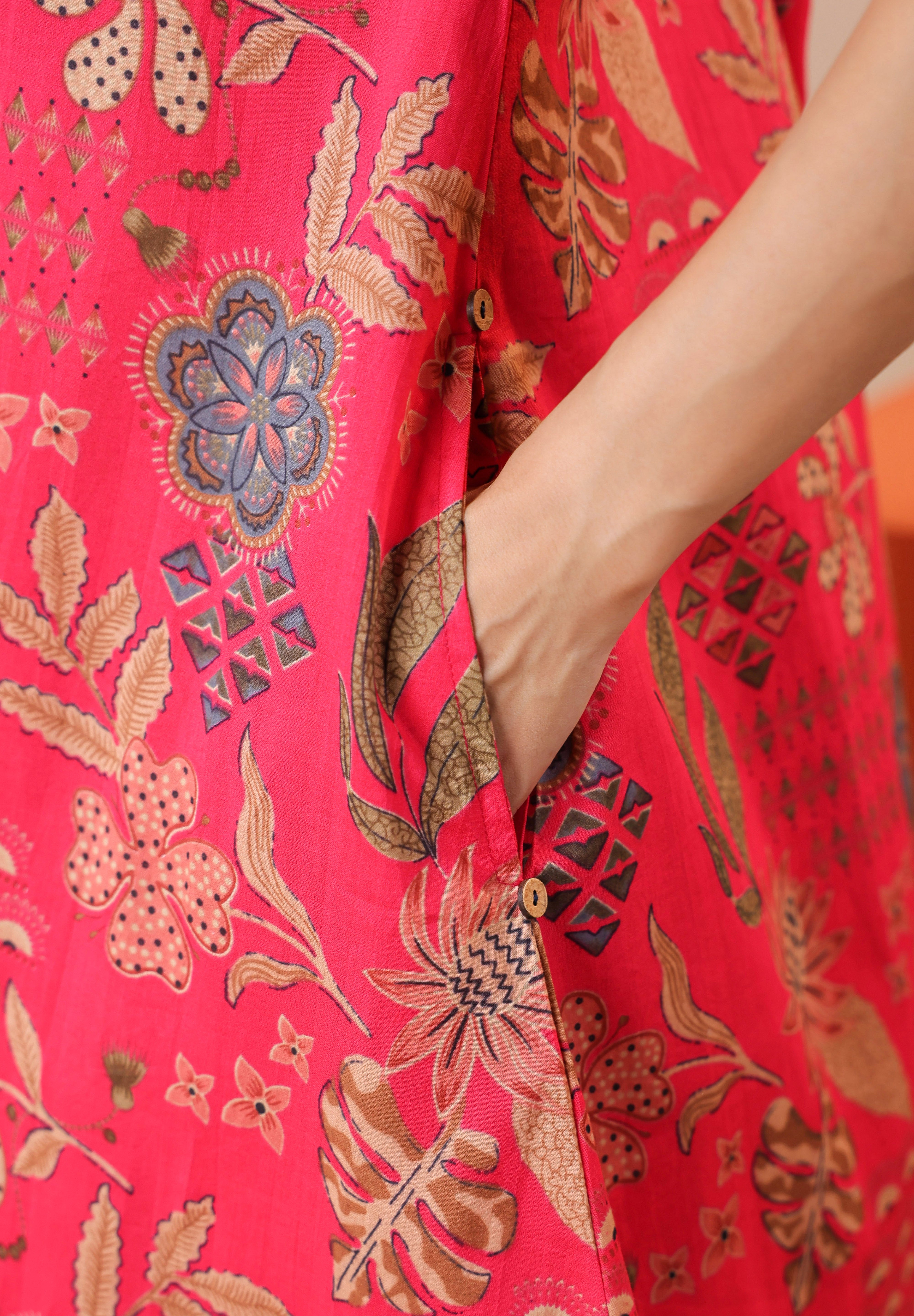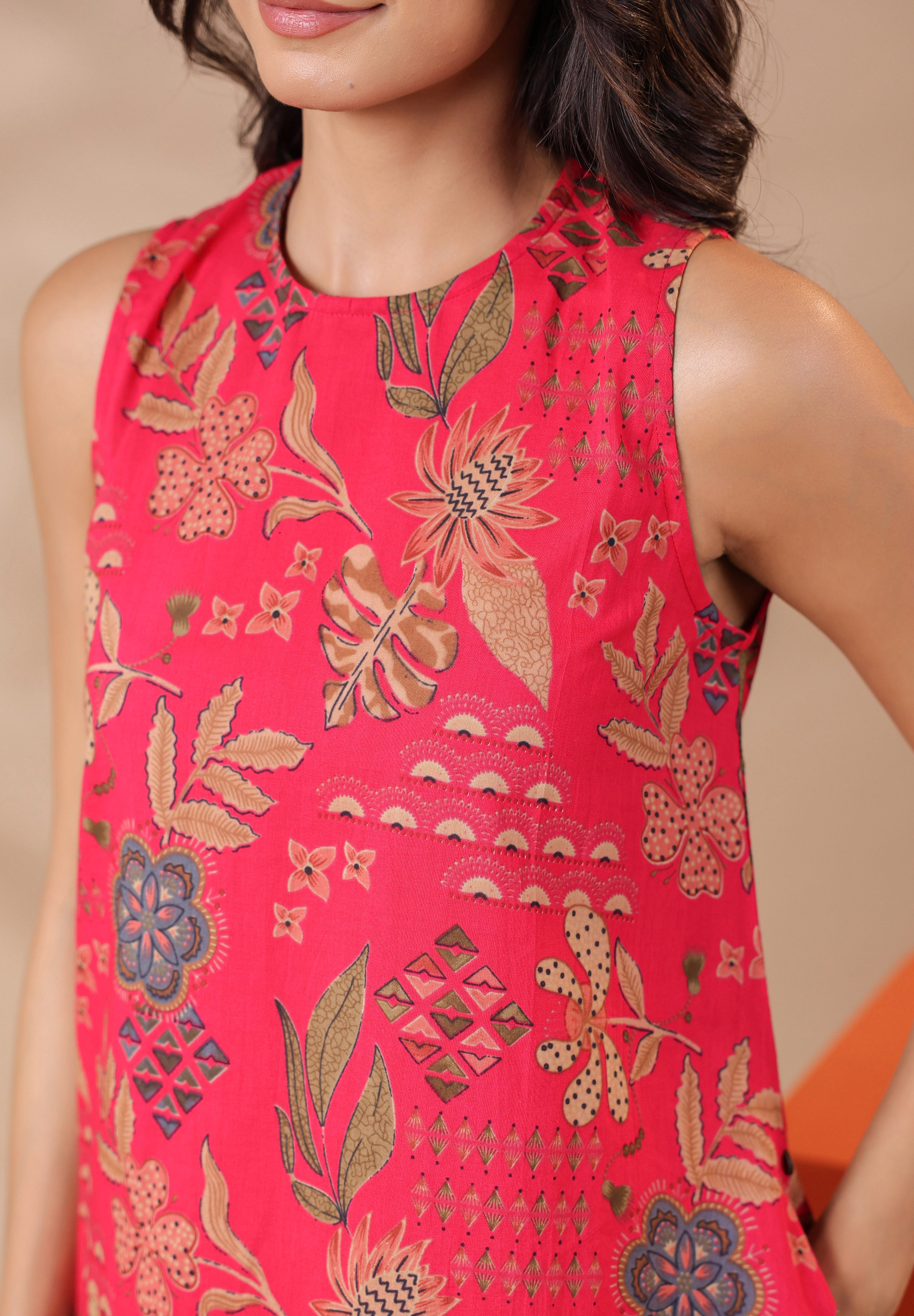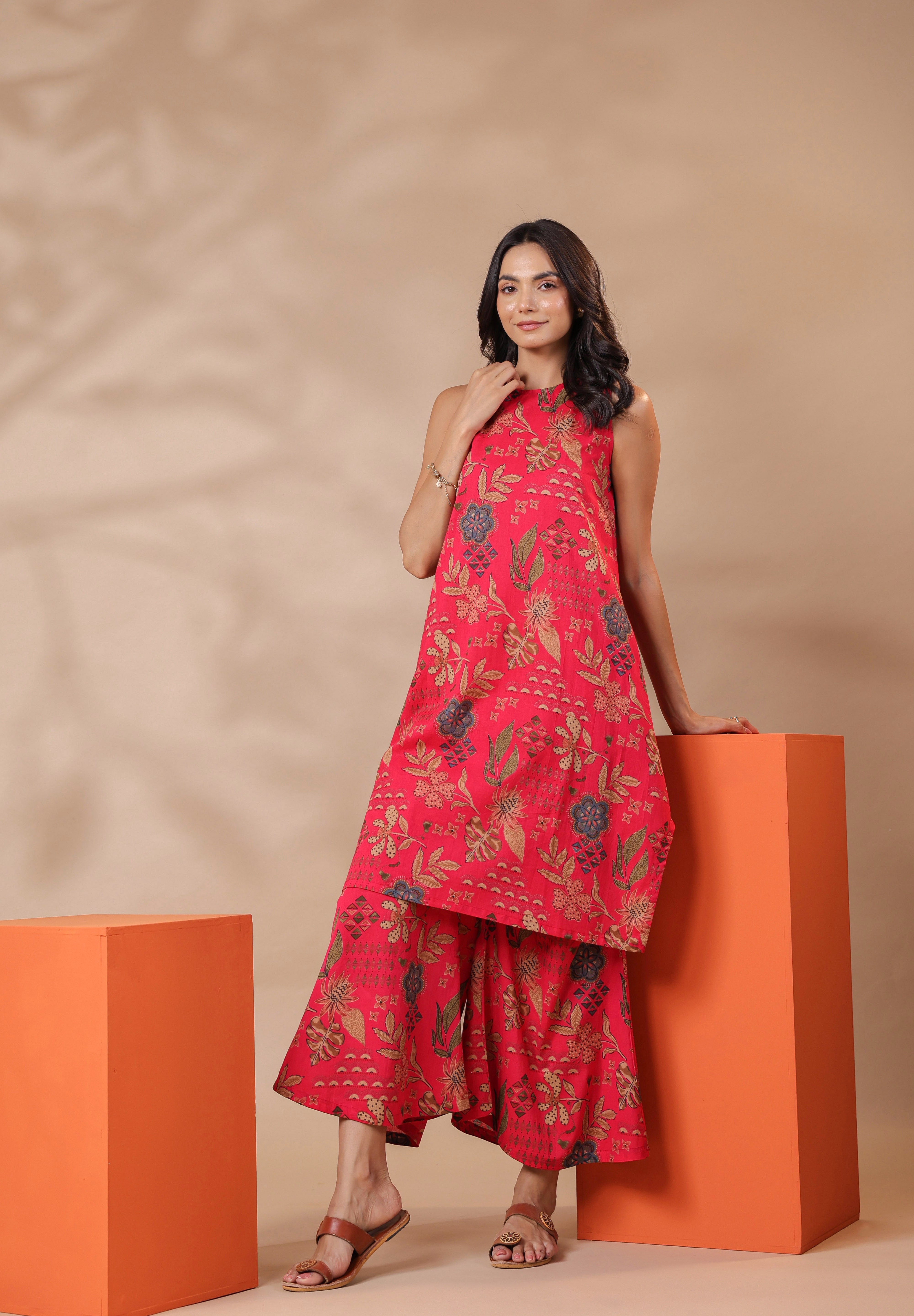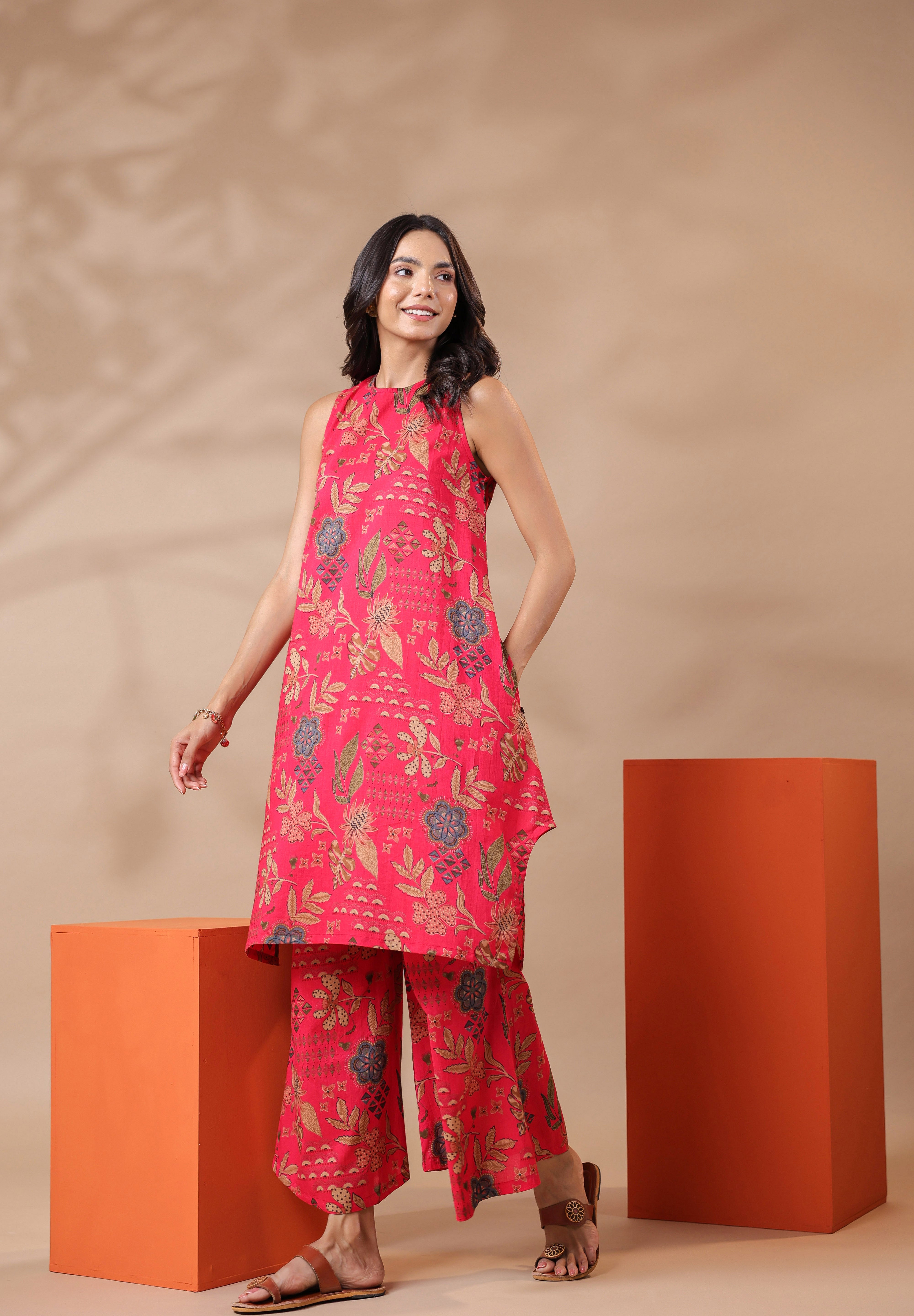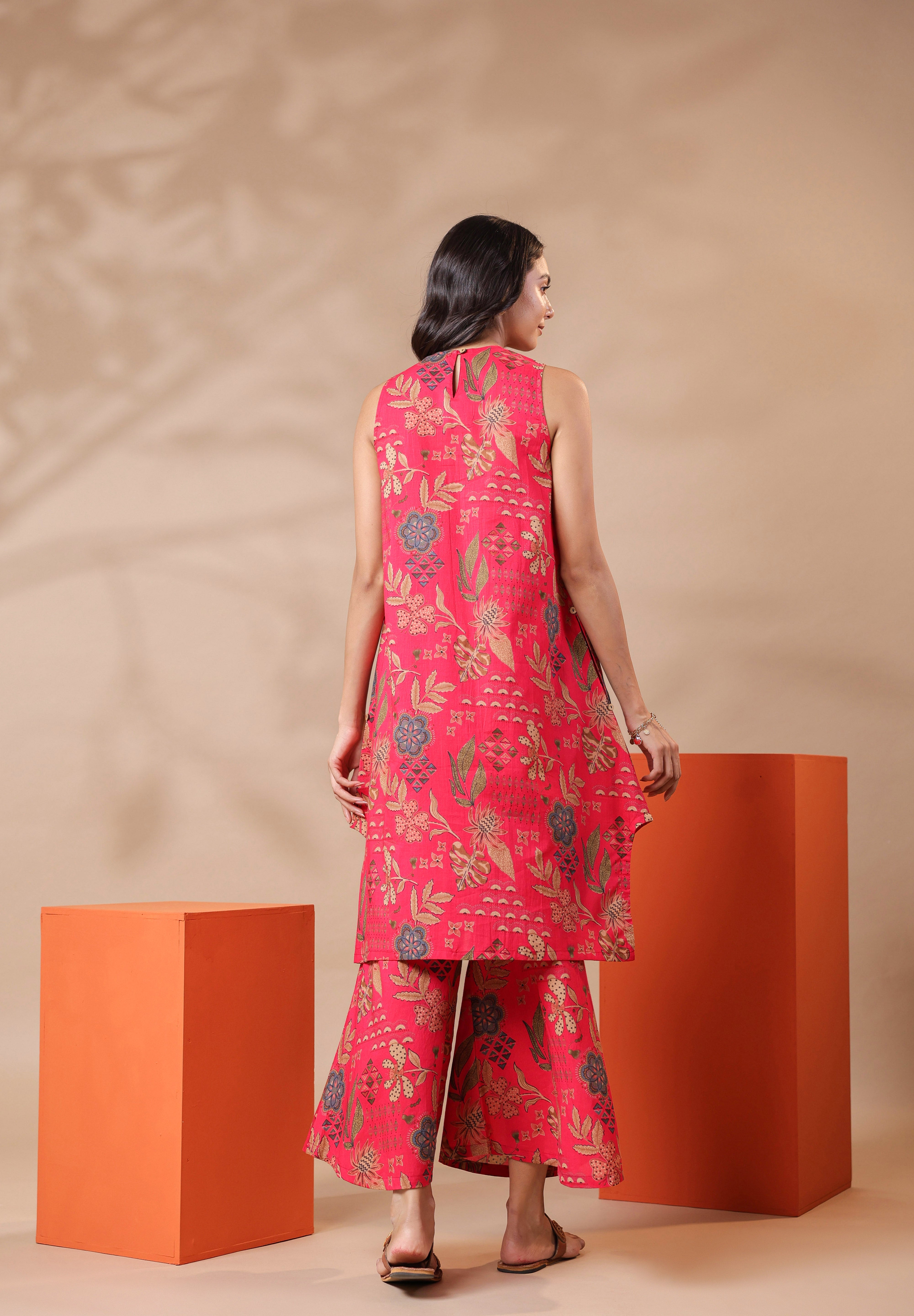Pink Printed Sleeveless Cotton Kurta & Pants Set