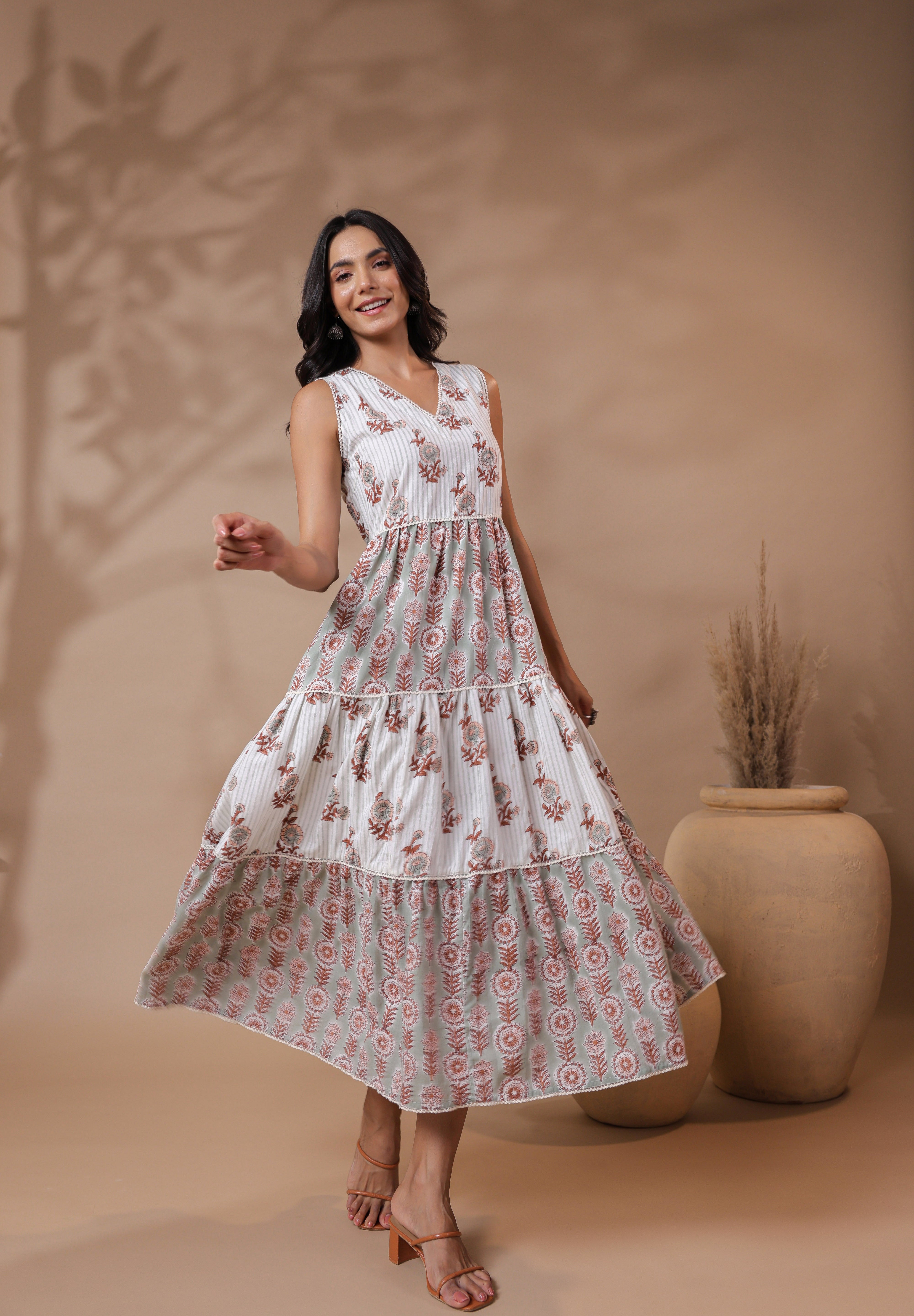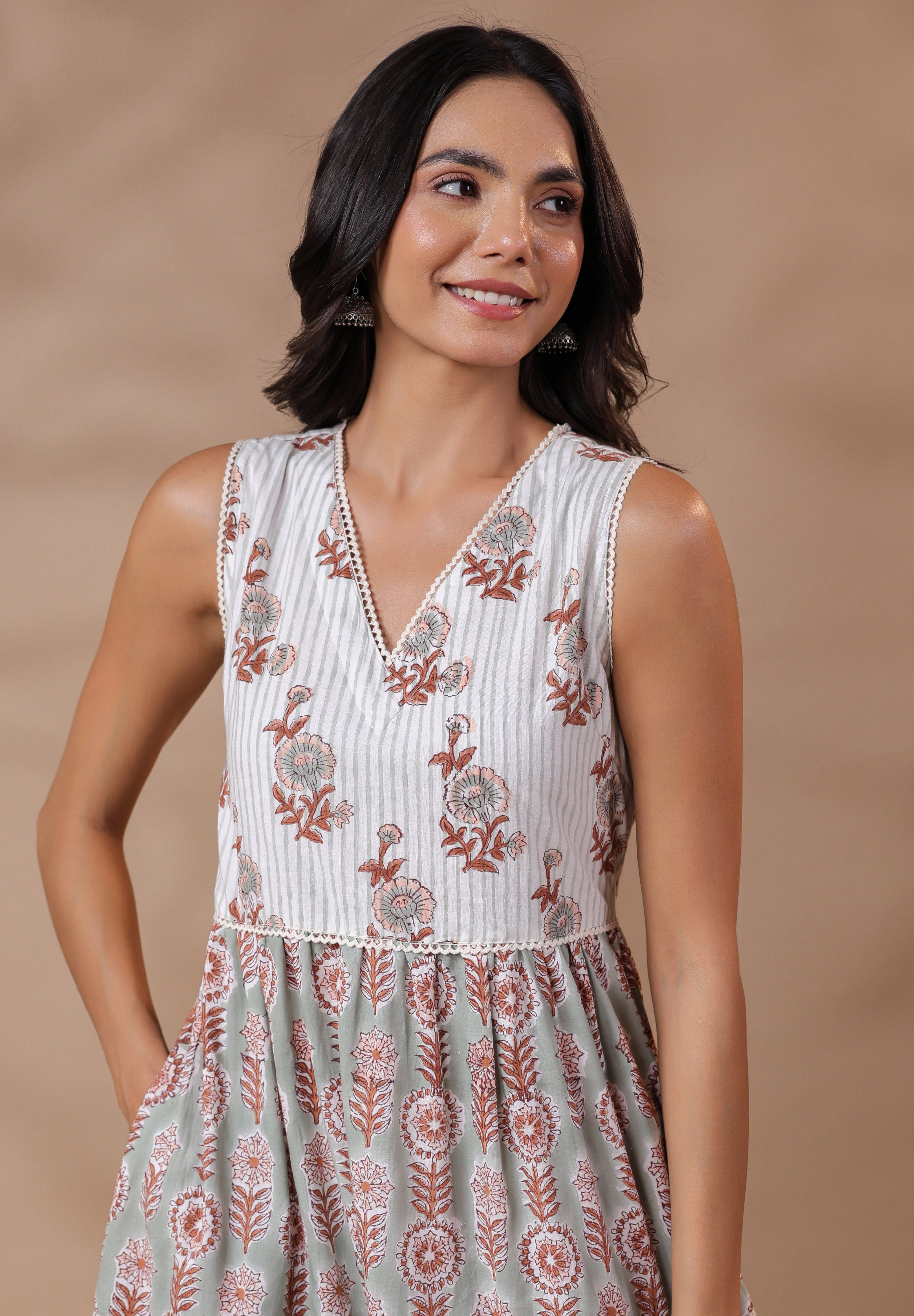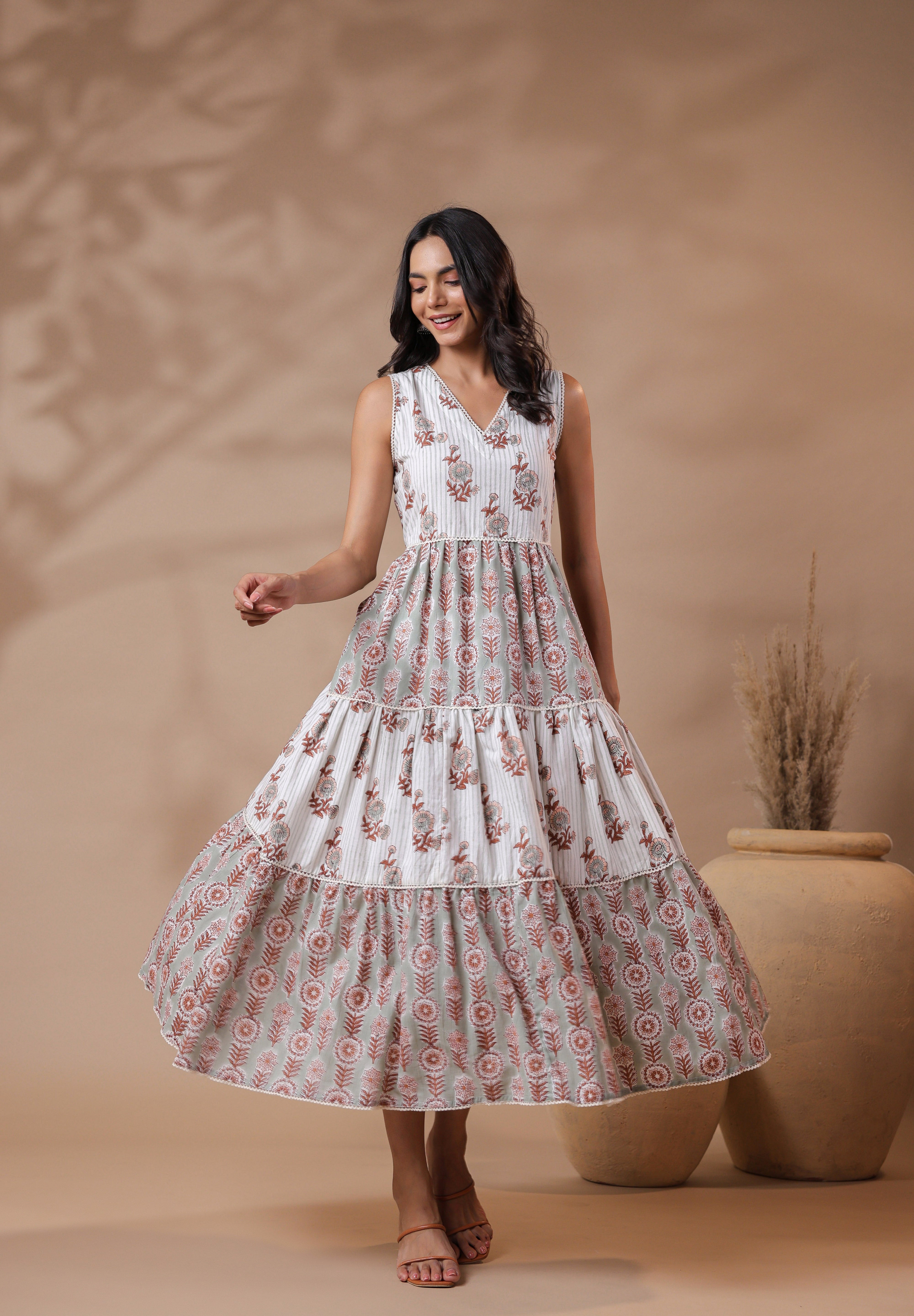 Embrace effortless summer style with this beautifully crafted V-neck handblock printed maxi dress.The soft cotton lining ensures all-day comfort, while the intricate cotton waist detailing adds a flattering touch. Whether you're heading out for a brunch, a casual day in the city, or a summer getaway, this breezy and breathable dress is the perfect pick for warm weather days.