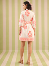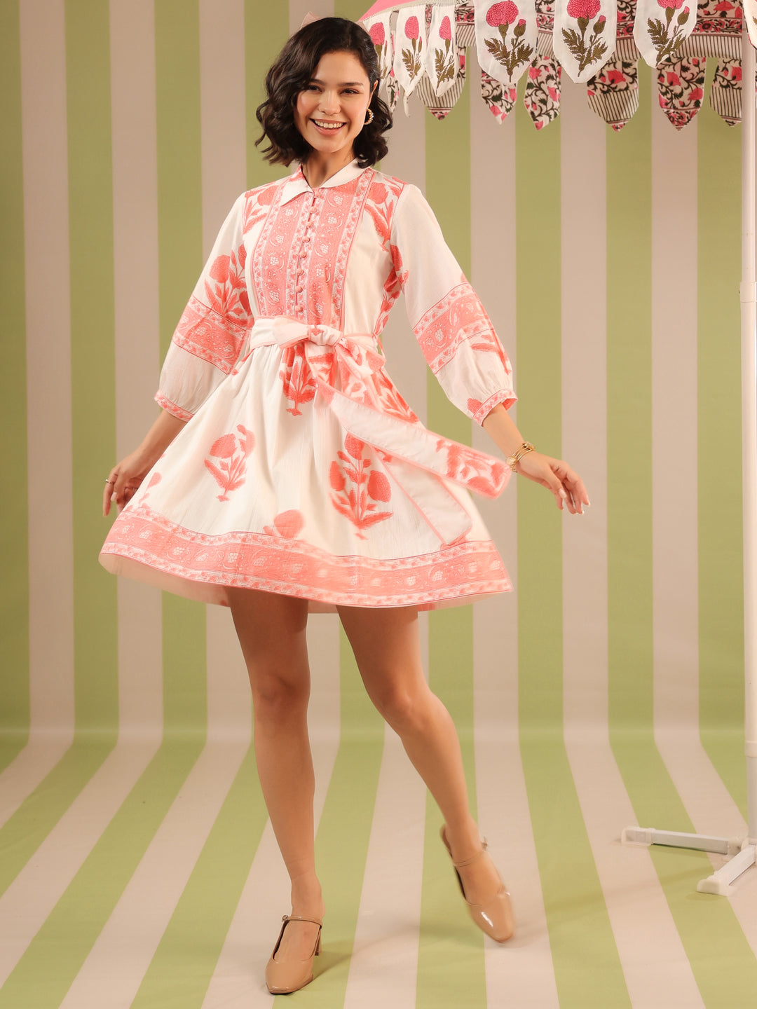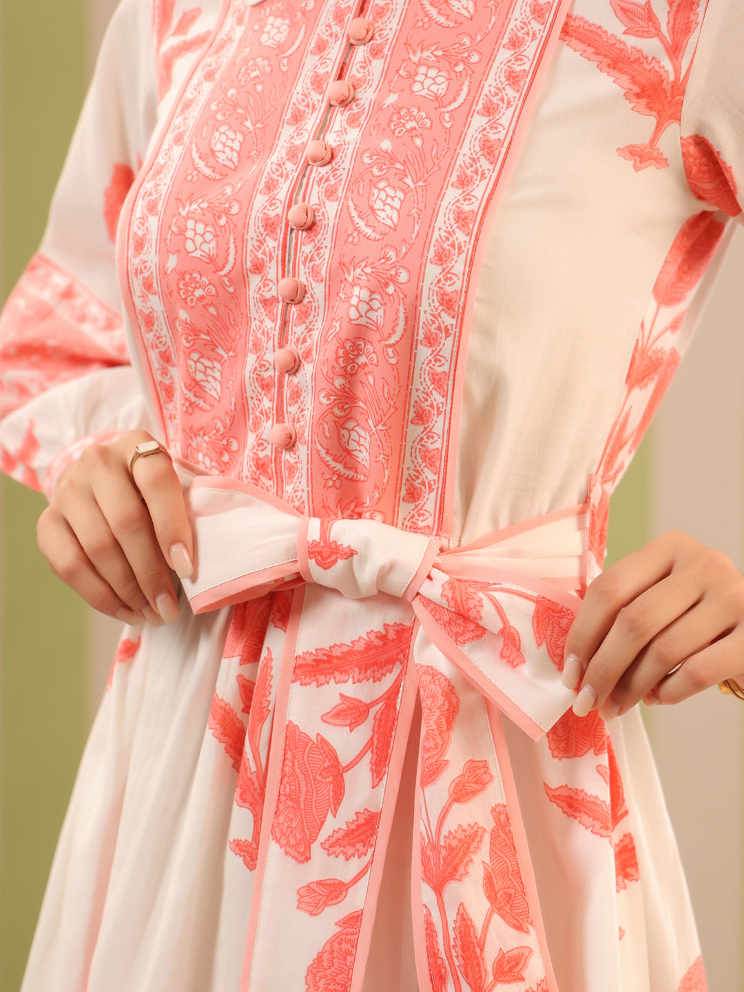 White & Pink Pastel Mughal Motif Tiered Cotton Dress with Lining