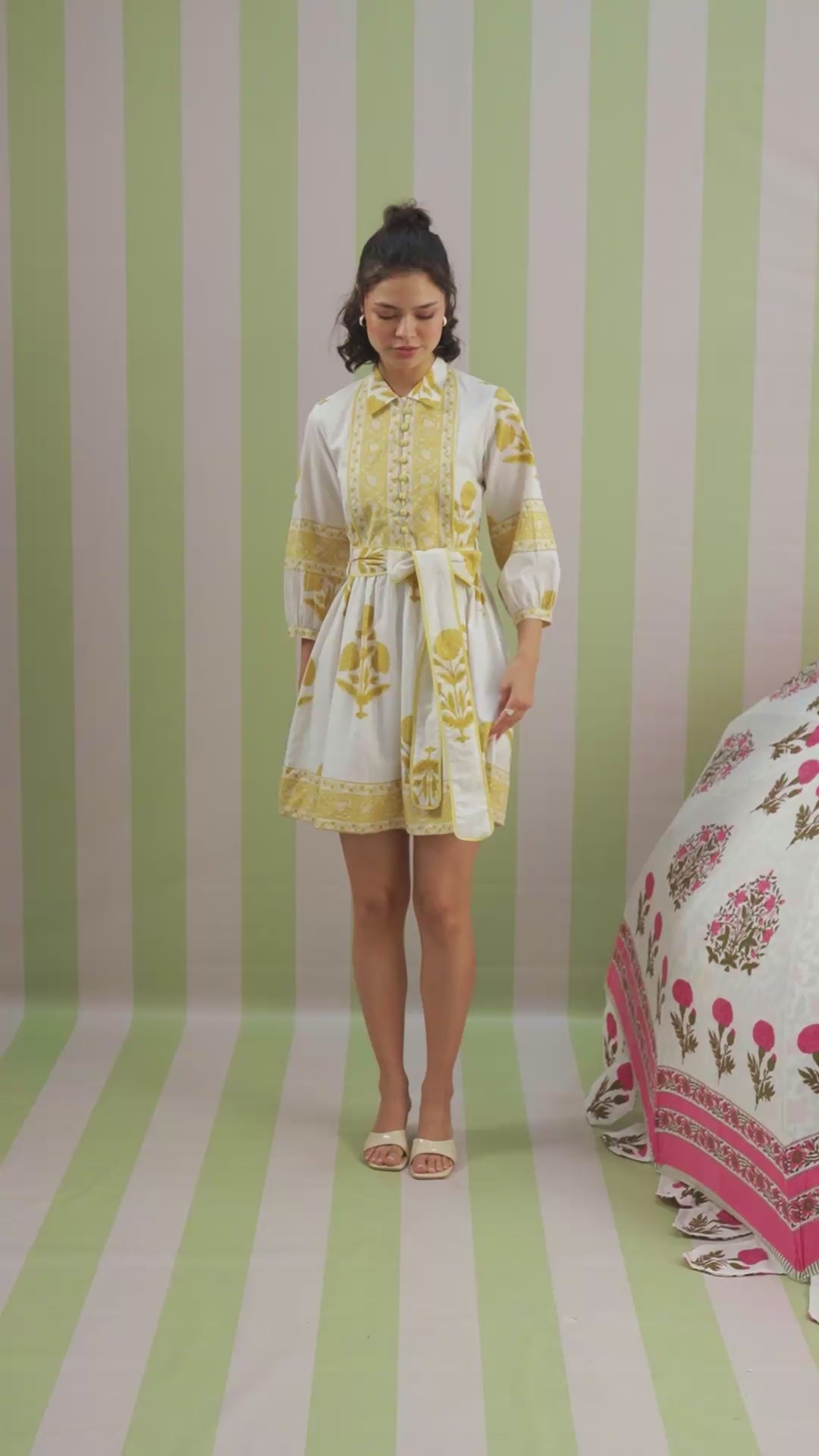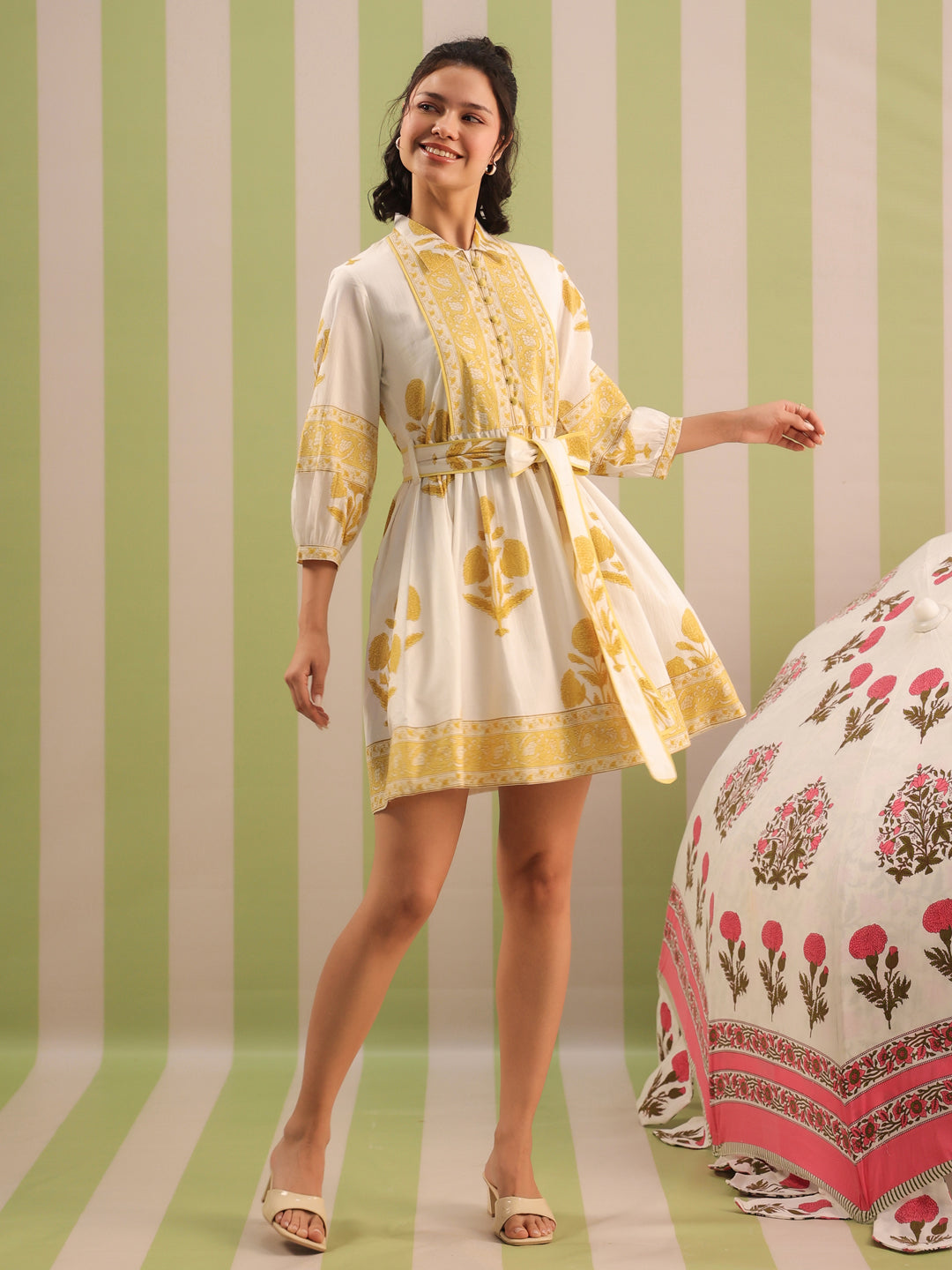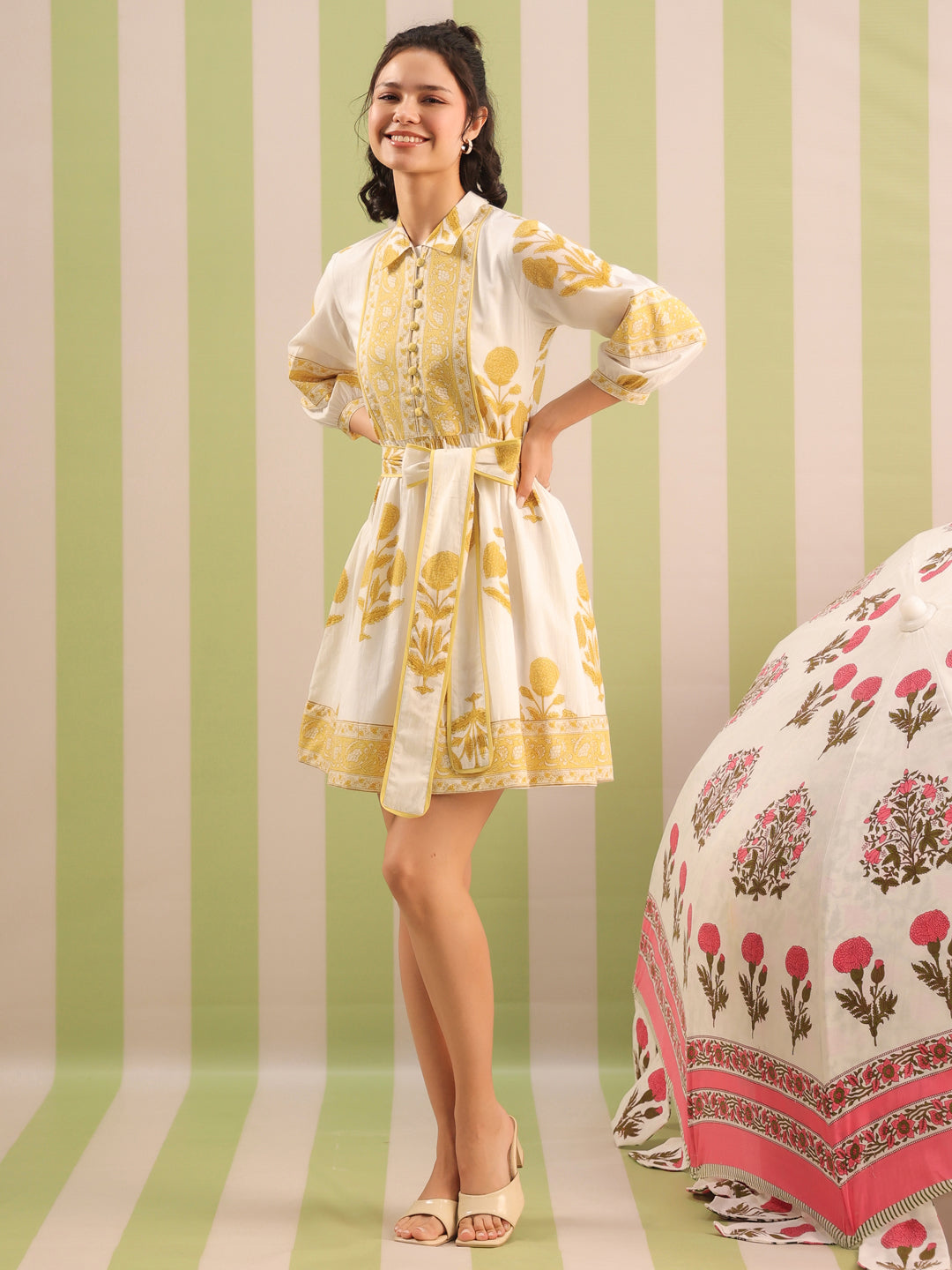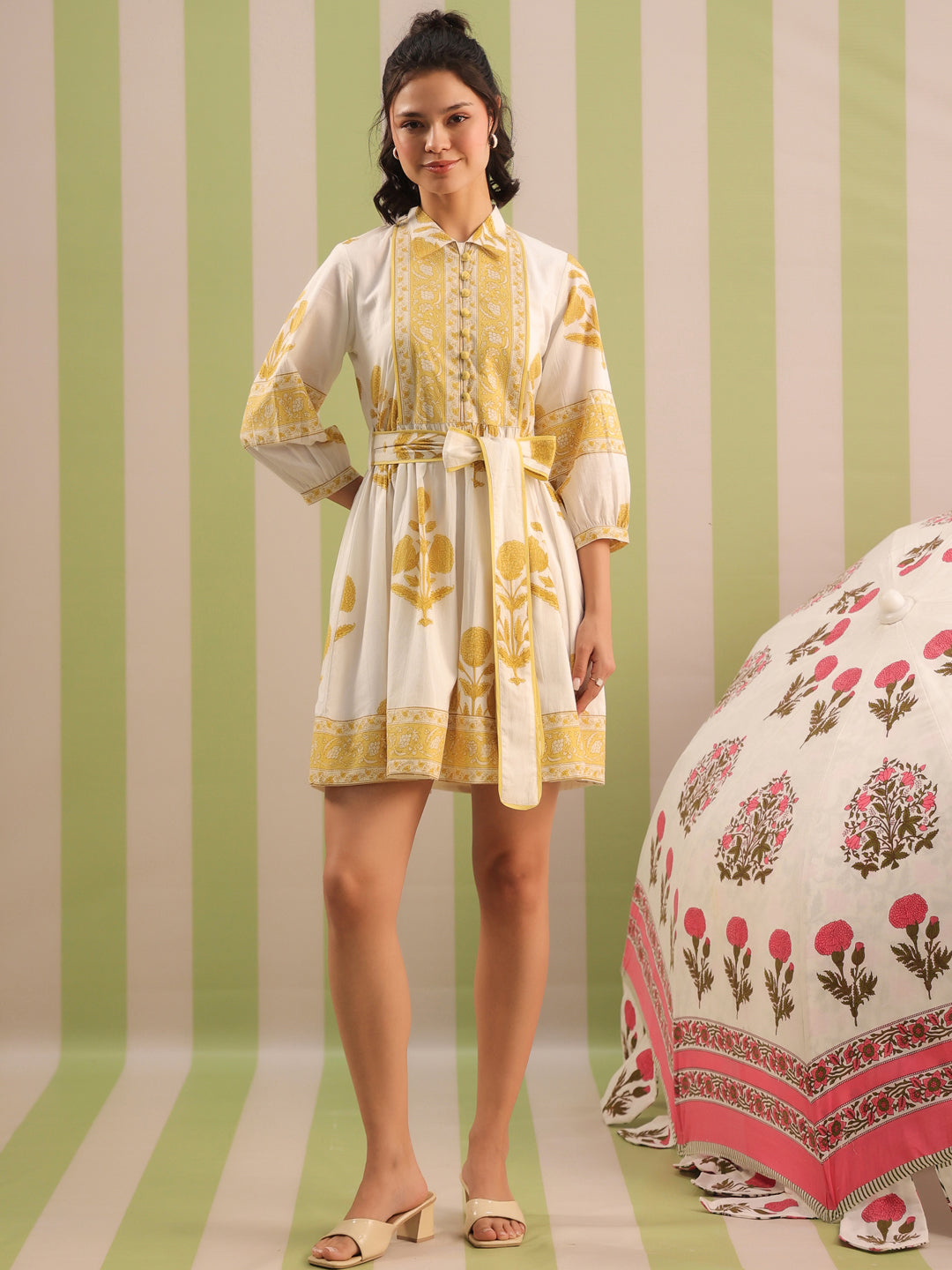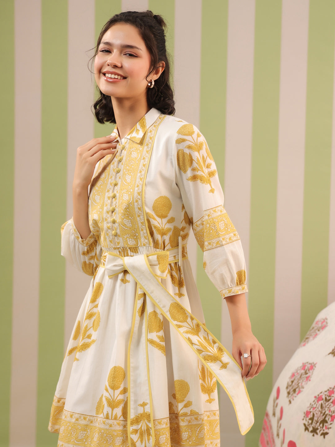 Elevate your everyday wardrobe with this white and pastel yellow Mughal motif printed tier dress. Designed in breathable cotton and fully lined for comfort, this piece features a soft flared silhouette and charming details that make it perfect for day events, brunches, or easy summer outings.