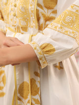White & Yellow Mughal Motif Tiered Cotton Dress with Lining