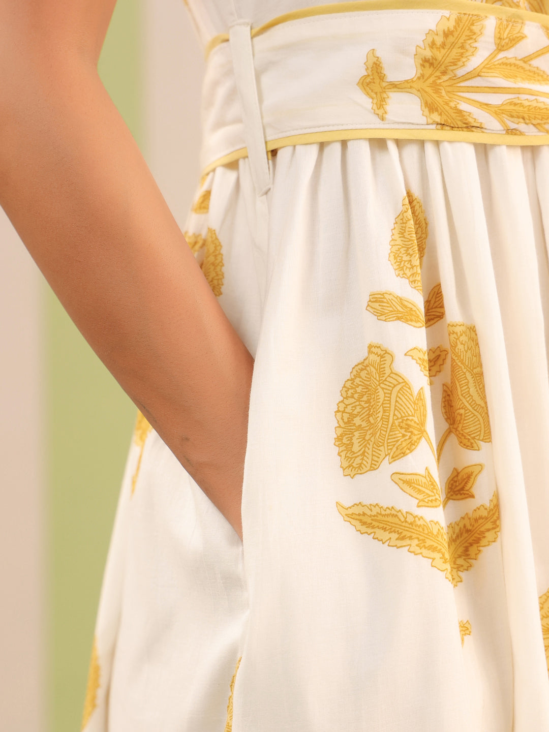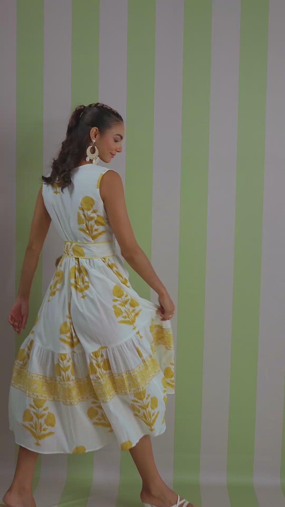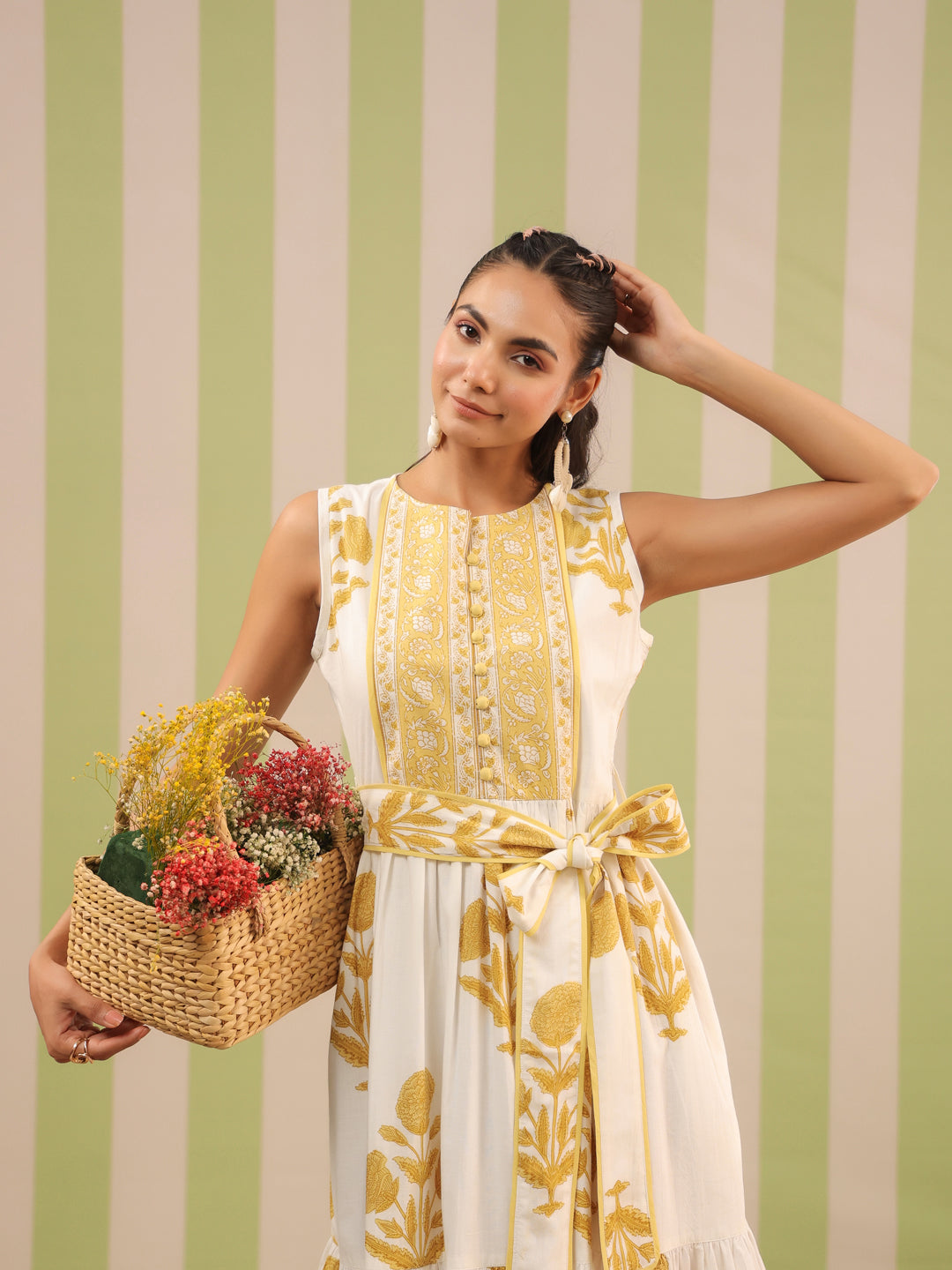 White & Yellow Sleeveless Maxi Dress with Belt and Pockets