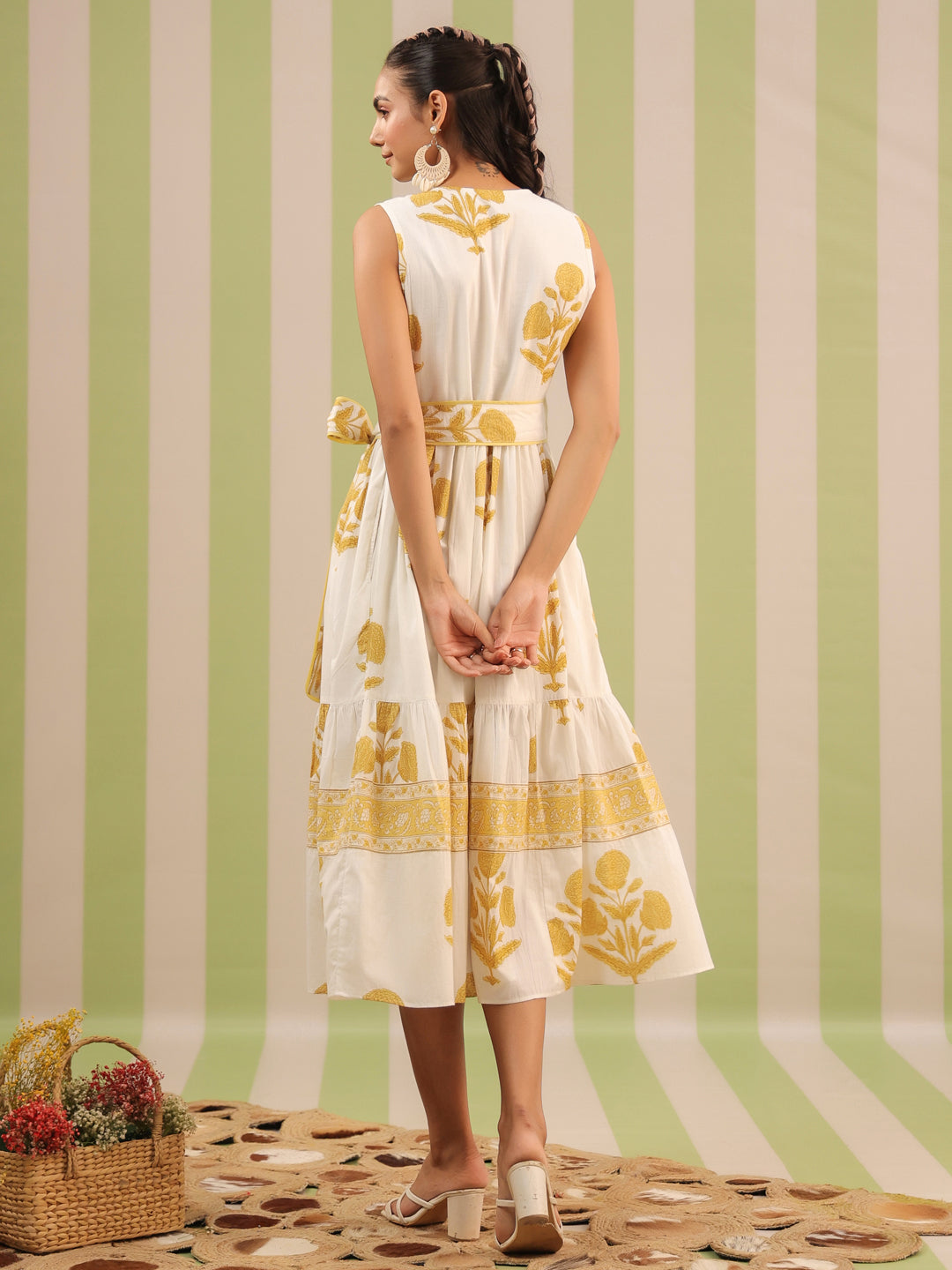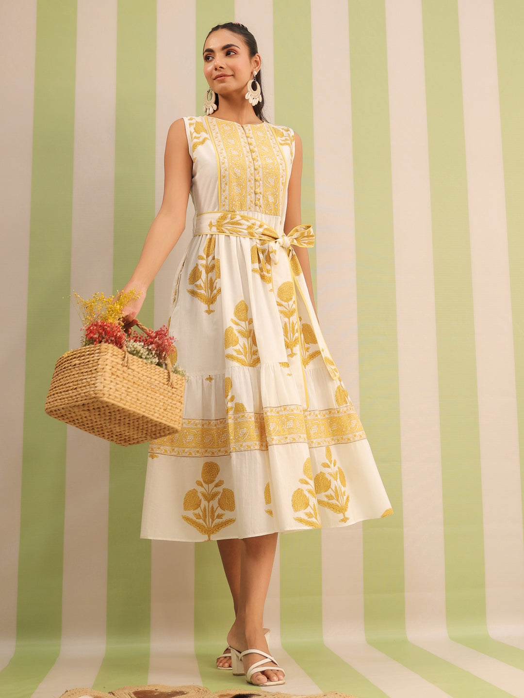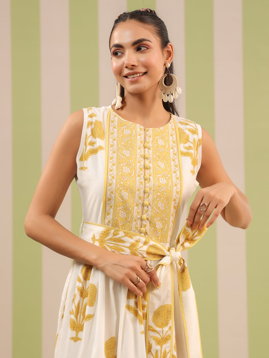 White & Yellow Sleeveless Maxi Dress with Belt and Pockets